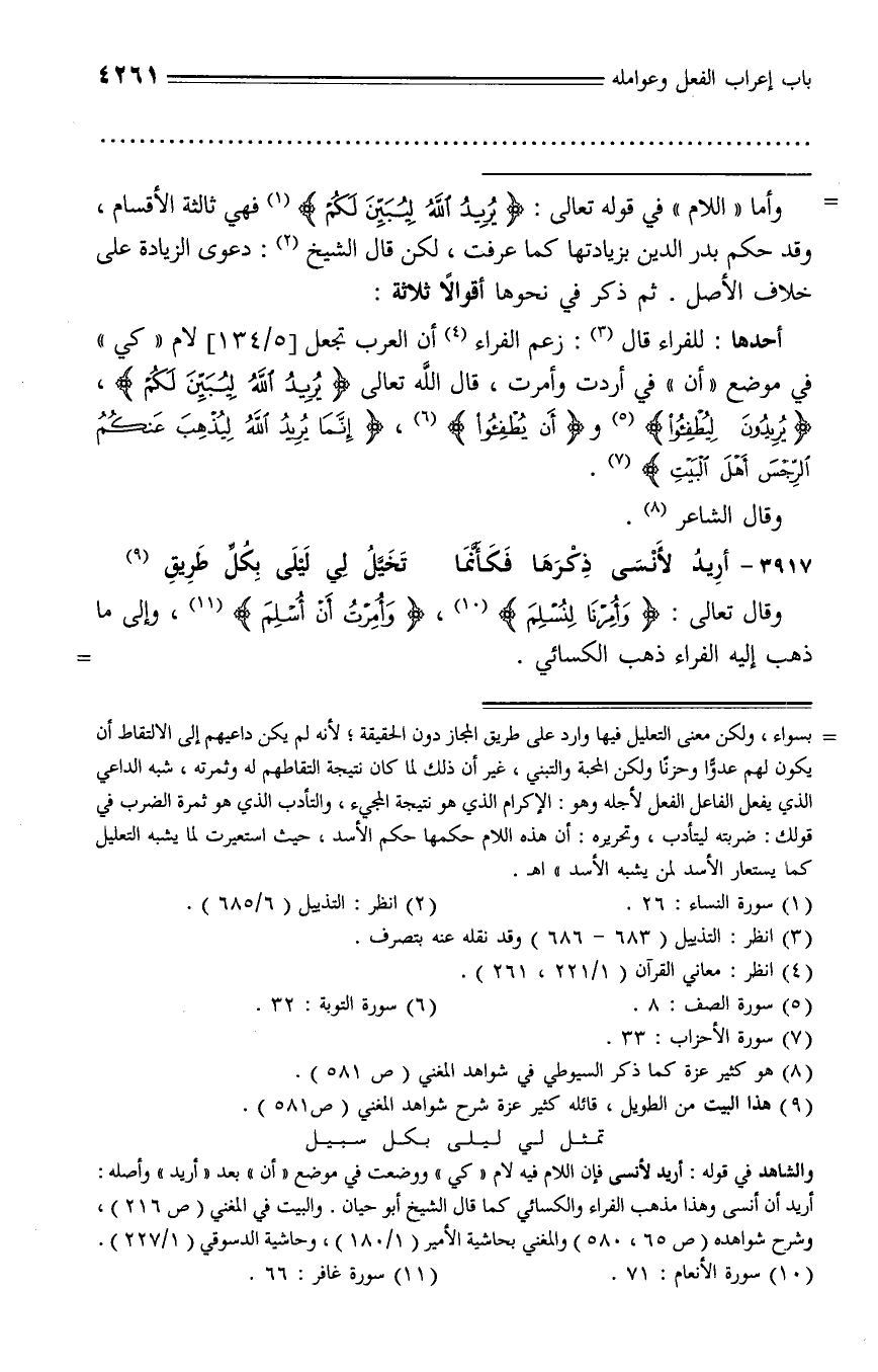 أحدها: للفراء قال (¬3): زعم الفراء (¬4) أن العرب تجعل [5/ 134] لام «كي» في موضع «أن» في أردت وأمرت، قال الله تعالى يُرِيدُ اللَّهُ لِيُبَيِّنَ لَكُمْ، يُرِيدُونَ لِيُطْفِؤُا (¬5) وأَنْ يُطْفِؤُا (¬6)، إِنَّما يُرِيدُ اللَّهُ لِيُذْهِبَ عَنْكُمُ الرِّجْسَ أَهْلَ الْبَيْتِ (¬7).