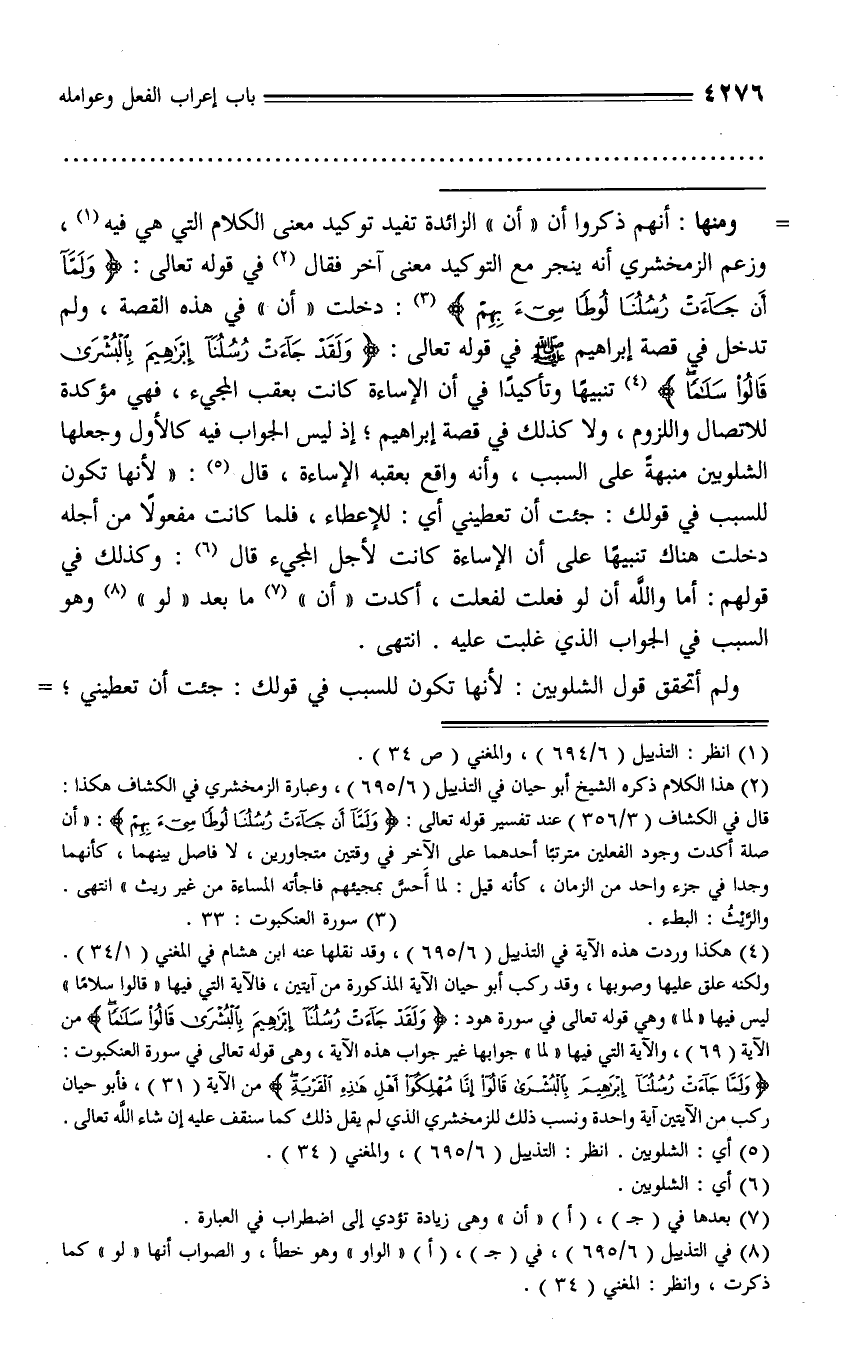 (¬4) هكذا وردت هذه الآية في التذييل (6/ 695)، وقد نقلها عنه ابن هشام في المغني (1/ 34).