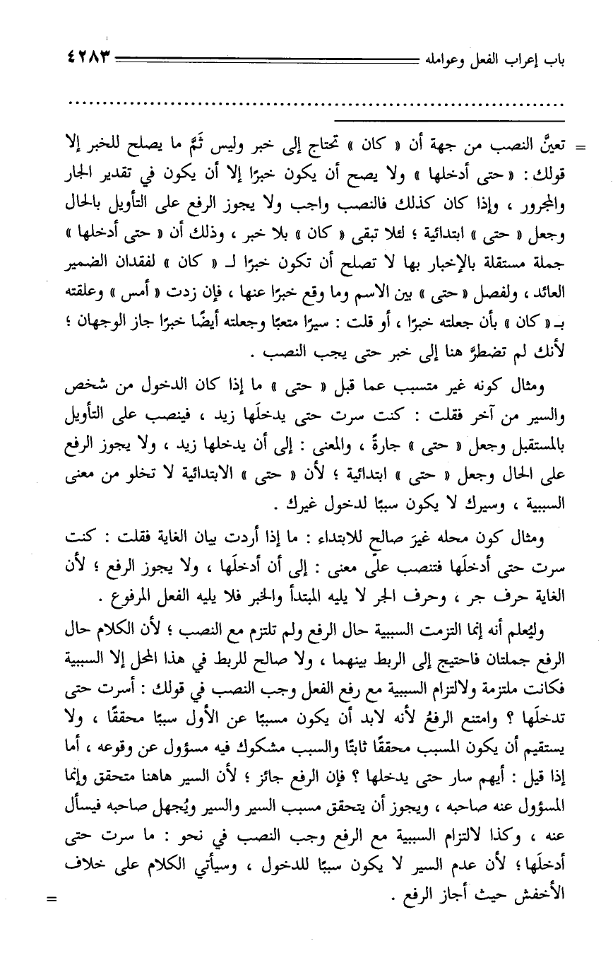 ومثال كونه غير متسبب عما قبل «حتى» ما إذا كان الدخول من شخص والسير من آخر فقلت: كنت سرت حتى يدخلها زيد، فينصب على التأويل بالمستقبل وجعل «حتى» جارة، والمعنى: إلى أن يدخلها زيد، ولا يجوز الرفع على الحال وجعل «حتى» ابتدائية؛ لأن «حتى» الابتدائية لا تخلو من معنى السببية، وسيرك لا يكون سببا لدخول غيرك.