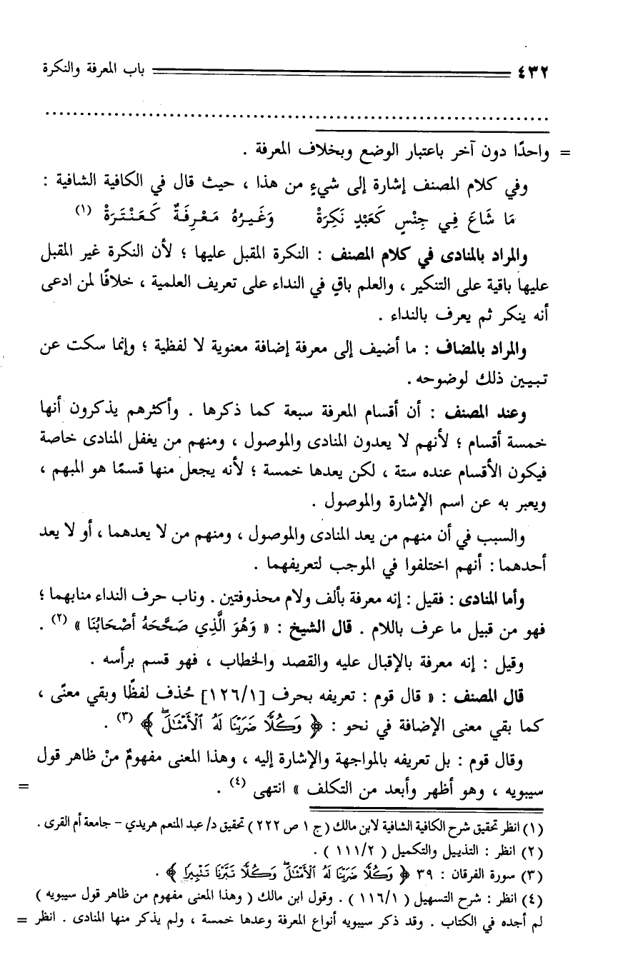 (¬4) انظر: شرح التسهيل (1/ 116). وقول ابن مالك (وهذا المعنى مفهوم من ظاهر قول سيبويه) لم أجده في الكتاب. وقد ذكر سيبويه أنواع المعرفة وعدها خمسة، ولم يذكر منها المنادى. انظر -