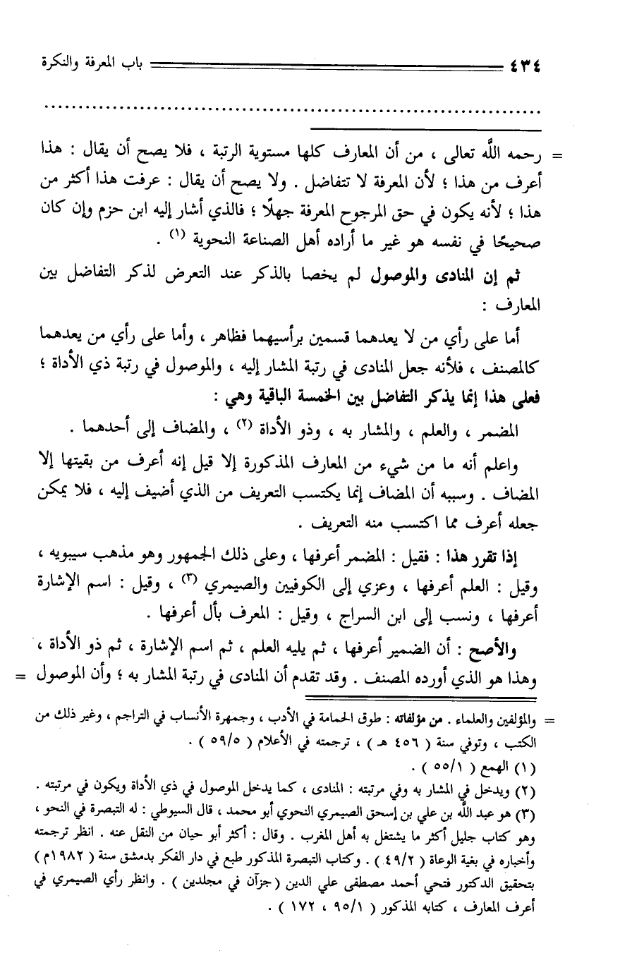 رحمه الله تعالى، من أن المعارف كلها مستوية الرتبة، فلا يصح أن يقال: هذا أعرف من هذا؛ لأن المعرفة لا تتفاضل. ولا يصح أن يقال: عرفت هذا أكثر من هذا؛ لأنه يكون في حق المرجوح المعرفة جهلا؛ فالذي أشار إليه ابن حزم وإن كان صحيحا في نفسه هو غير ما أراده أهل الصناعة النحوية (¬1).