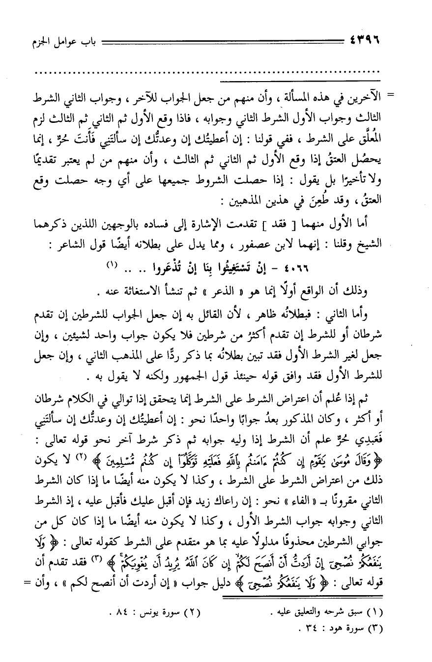 وَقالَ مُوسى يا قَوْمِ إِنْ كُنْتُمْ آمَنْتُمْ بِاللَّهِ فَعَلَيْهِ تَوَكَّلُوا إِنْ كُنْتُمْ مُسْلِمِينَ (¬2) لا يكون ذلك من اعتراض الشرط على الشرط، وكذا لا يكون منه أيضا ما إذا كان الشرط الثاني مقرونا بـ «الفاء» نحو: إن راعاك زيد فإن أقبل عليك فأقبل عليه، إذ الشرط الثاني وجوابه جواب الشرط الأول، وكذا لا يكون منه أيضا ما إذا كان كل من جوابي الشرطين محذوفا مدلولا عليه بما هو متقدم على الشرط كقوله تعالى: وَلا يَنْفَعُكُمْ نُصْحِي إِنْ أَرَدْتُ أَنْ أَنْصَحَ لَكُمْ إِنْ كانَ اللَّهُ يُرِيدُ أَنْ يُغْوِيَكُمْ (¬3) فقد تقدم أن قوله تعالى: وَلا يَنْفَعُكُمْ نُصْحِي دليل جواب «إن أردت أن أنصح لكم»، وأن -