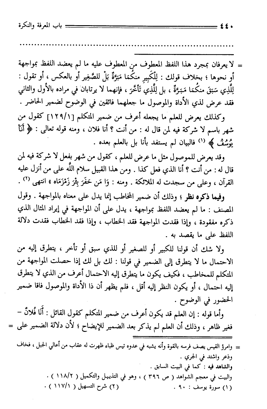 ولا شك أن قولنا للكبير أو للصغير أو للذي سبق أو تأخر، يتطرق إليه من الاحتمال ما لا يتطرق إلى الضمير في قولنا: لك بل لك إذا حصلت المواجهة من المتكلم للمخاطب، فكيف يكون ما يتطرق إليه الاحتمال أعرف من الذي لا يتطرق إليه احتمال، أو يكون النظر إليه أقل، فلم يظهر أن ذا الأداة والموصول فاقا ضمير الحضور في الوضوح.