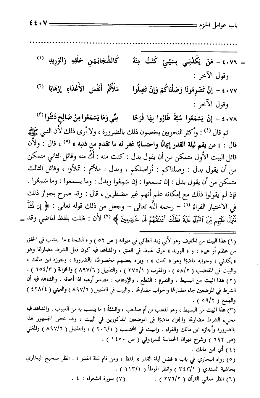 ثم قال (¬4): وأكثر النحويين يخصون ذلك بالضرورة، ولا أرى ذلك لأن النبي صلّى الله عليه وسلّم قال: «من يقم ليلة القدر إيمانا واحتسابا غفر له ما تقدم من ذنبه» (¬5)، قال: ولأن قائل البيت الأول متمكن من أن يقول بدل: كنت منه: أك منه وقائل الثاني متمكن من أن يقول بدل: وصلناكم: نواصلكم، وبدل: ملأتم: تملأوا، وقائل الثالث متمكن من أن يقول بدل: إن تسمعوا: إن سمعوا وبدل: وما يسمعوا: وما سمعوا.