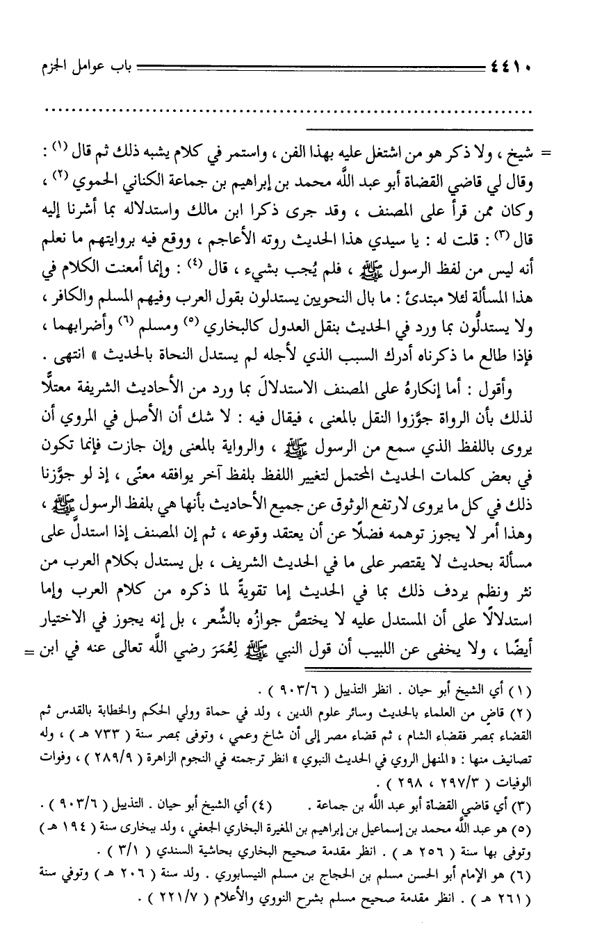 وقال لي قاضي القضاة أبو عبد الله محمد بن إبراهيم بن جماعة الكناني الحموي (¬2)، وكان ممن قرأ على المصنف، وقد جرى ذكرا ابن مالك واستدلاله بما أشرنا إليه قال (¬3): قلت له: يا سيدي هذا الحديث روته الأعاجم، ووقع فيه بروايتهم ما نعلم أنه ليس من لفظ الرسول صلّى الله عليه وسلّم، فلم يجب بشيء، قال (¬4): وإنما أمعنت الكلام في هذا المسألة لئلا مبتدئ: ما بال النحويين يستدلون بقول العرب وفيهم المسلم والكافر، ولا يستدلّون بما ورد في الحديث بنقل العدول كالبخاري (¬5) ومسلم (¬6) وأضرابهما، فإذا طالع ما ذكرناه أدرك السبب الذي لأجله لم يستدل النحاة بالحديث» انتهى.