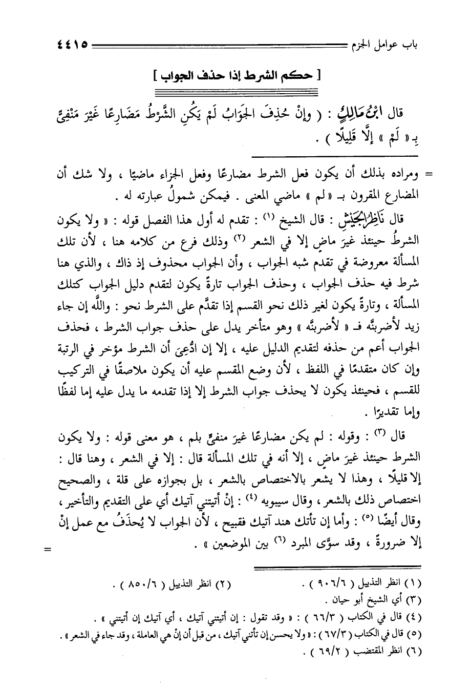 قال ابن مالك: (وإن حذف الجواب لم يكن الشّرط مضارعا غير منفىّ بـ «لم» إلّا قليلا).