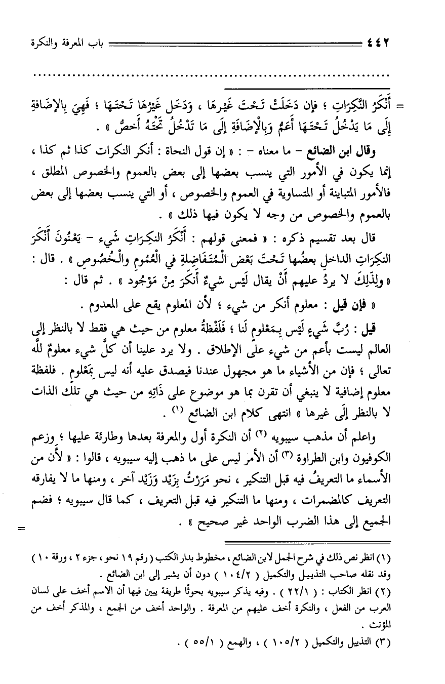 (¬1) انظر نص ذلك في شرح الجمل لابن الضائع، مخطوط بدار الكتب (رقم 19 نحو، جزء 2، ورقة 10) وقد نقله صاحب التذييل والتكميل (2/ 104) دون أن يشير إلى ابن الضائع.