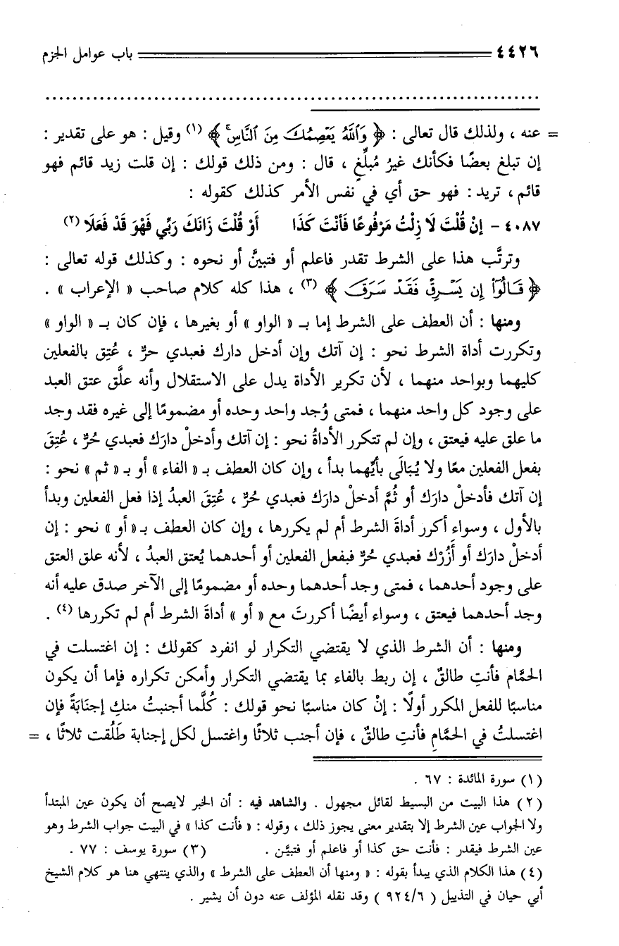 (¬4) هذا الكلام الذي يبدأ بقوله: «ومنها أن العطف على الشرط» والذي ينتهي هنا هو كلام الشيخ أبي حيان في التذييل (6/ 924) وقد نقله المؤلف عنه دون أن يشير.