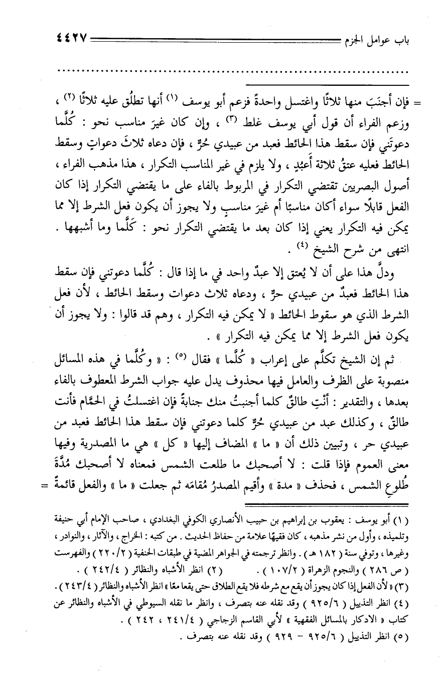 فإن أجنب منها ثلاثا واغتسل واحدة فزعم أبو يوسف (¬1) أنها تطلق عليه ثلاثا (¬2)، وزعم الفراء أن قول أبي يوسف غلط (¬3)، وإن كان غير مناسب نحو: كلّما دعوتني فإن سقط هذا الحائط فعبد من عبيدي حرّ، فإن دعاه ثلاث دعوات وسقط الحائط فعليه عتق ثلاثة أعبد، ولا يلزم في غير المناسب التكرار، هذا مذهب الفراء، أصول البصريين تقتضي التكرار في المربوط بالفاء على ما يقتضي التكرار إذا كان الفعل قابلا سواء أكان مناسبا أم غير مناسب ولا يجوز أن يكون فعل الشرط إلا مما يمكن فيه التكرار يعني إذا كان بعد ما يقتضي التكرار نحو: كلّما وما أشبهها.