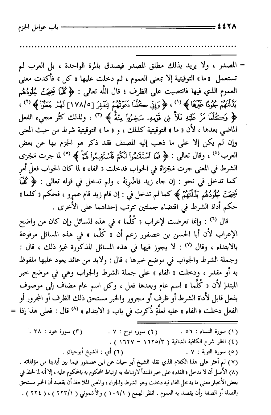 وجملة الشرط والجواب في موضع خبرها، قال: ولا بد من عائد يعود عليها ملفوظ به أو مقدر، ودخلت «الفاء» على جملة الشرط والجواب وهي في موضع خبر المبتدإ لأن «كلّما» اسم عام وبعدها فعل، وكل اسم عام مضاف إلى موصوف بفعل قابل لأداة الشرط أو ظرف أو مجرور والخبر مستحق ذلك الظرف أو المجرور أو الفعل دخلت «الفاء» عليه لعلّة ذكرت في باب «الابتداء» (¬8) قال: فعلى هذا إذا -