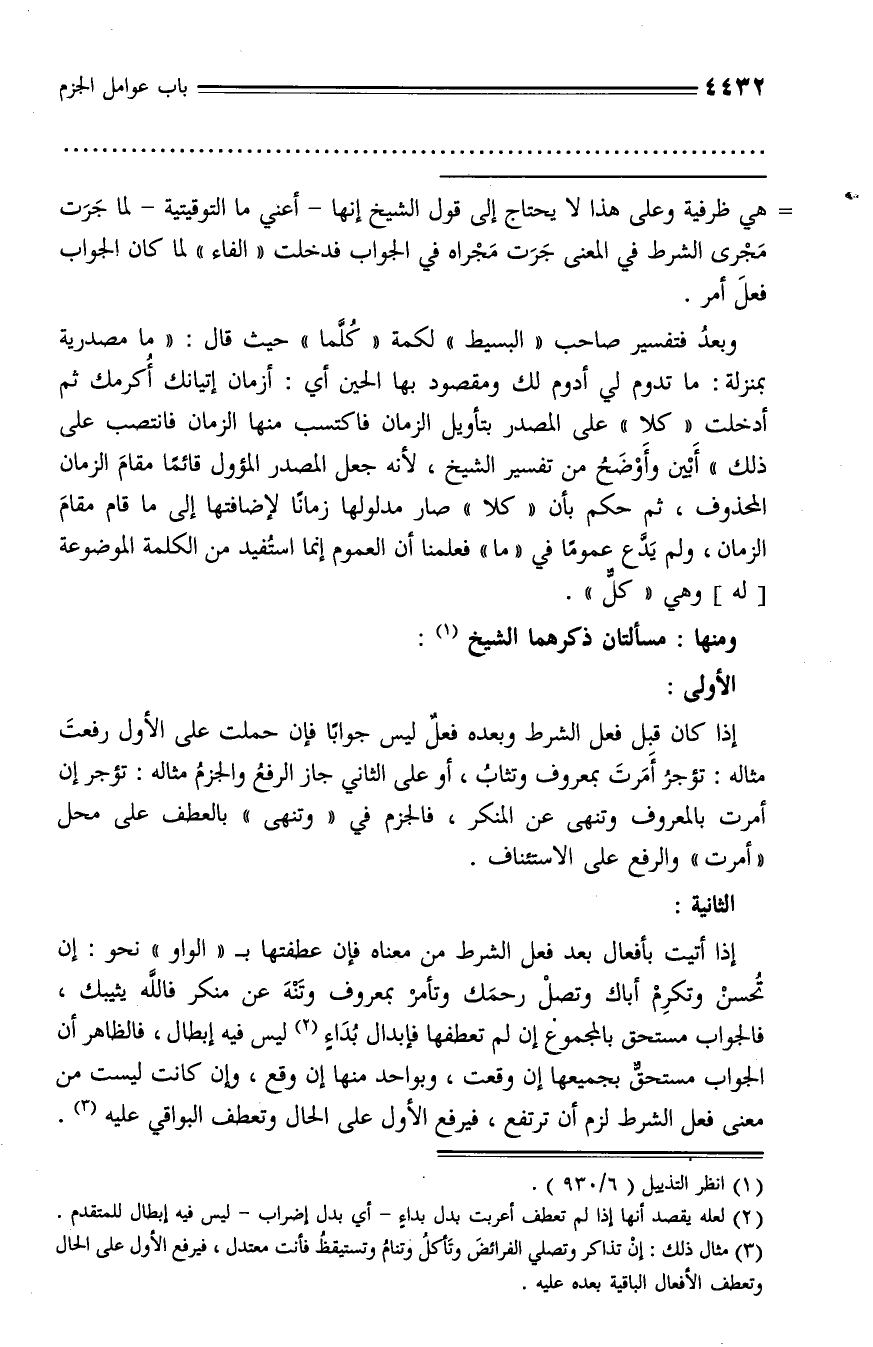 وبعد فتفسير صاحب «البسيط» لكلمة «كلّما» حيث قال: «ما مصدرية بمنزلة: ما تدوم لي أدوم لك ومقصود بها الحين أي: أزمان إتيانك أكرمك ثم أدخلت «كلا» على المصدر بتأويل الزمان فاكتسب منها الزمان فانتصب على ذلك» أبين وأوضح من تفسير الشيخ، لأنه جعل المصدر المؤول قائما مقام الزمان المحذوف، ثم حكم بأن «كلا» صار مدلولها زمانا لإضافتها إلى ما قام مقام الزمان، ولم يدّع عموما في «ما» فعلمنا أن العموم إنما استفيد من الكلمة الموضوعة [له] وهي «كلّ».