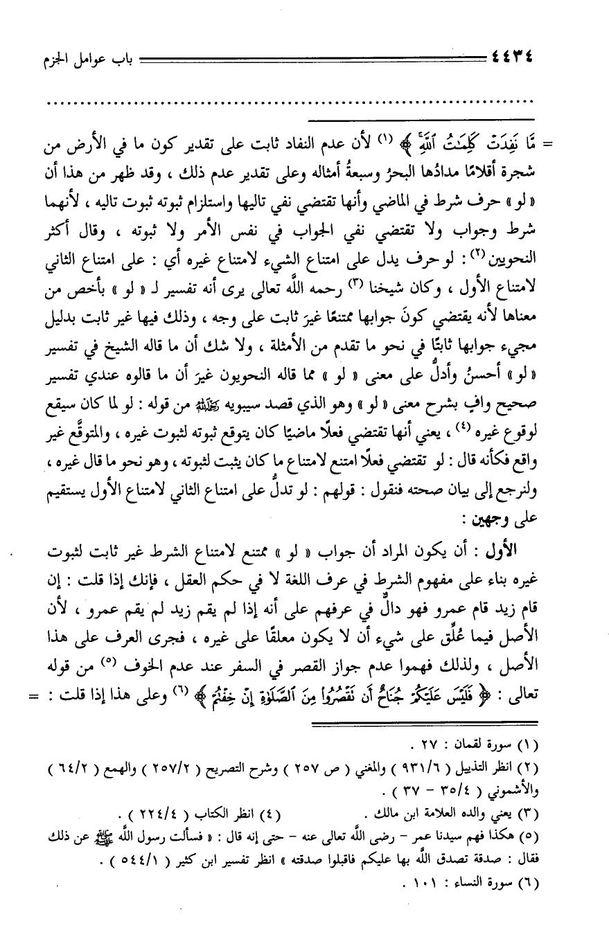 الأول: أن يكون المراد أن جواب «لو» ممتنع لامتناع الشرط غير ثابت لثبوت غيره بناء على مفهوم الشرط في عرف اللغة لا في حكم العقل، فإنك إذا قلت: إن قام زيد قام عمرو فهو دالّ في عرفهم على أنه إذا لم يقم زيد لم يقم عمرو، لأن الأصل فيما علّق على شيء أن لا يكون معلقا على غيره، فجرى العرف على هذا الأصل، ولذلك فهموا عدم جواز القصر في السفر عند عدم الخوف (¬5) من قوله تعالى: فَلَيْسَ عَلَيْكُمْ جُناحٌ أَنْ تَقْصُرُوا مِنَ الصَّلاةِ إِنْ خِفْتُمْ (¬6) وعلى هذا إذا قلت: -
