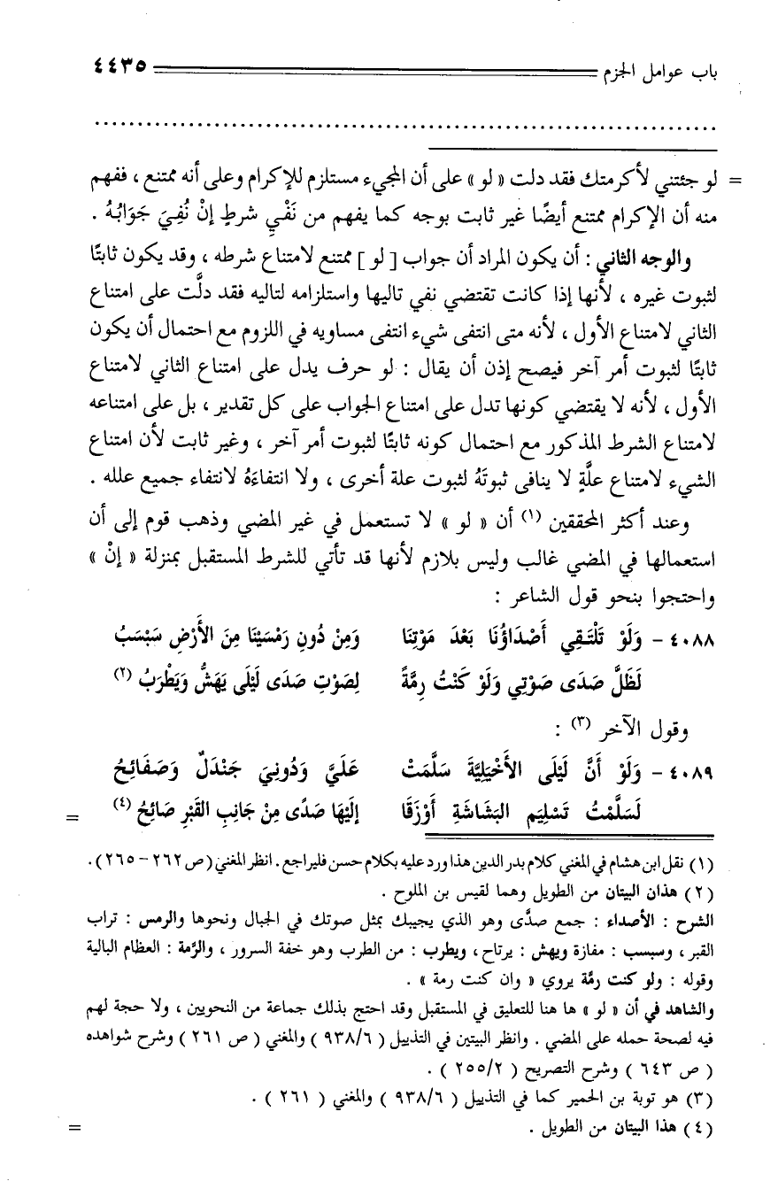والوجه الثاني: أن يكون المراد أن جواب [لو] ممتنع لامتناع شرطه، وقد يكون ثابتا لثبوت غيره، لأنها إذا كانت تقتضي نفي تاليها واستلزامه لتاليه فقد دلّت على امتناع الثاني لامتناع الأول، لأنه متى انتفى شيء انتفى مساويه في اللزوم مع احتمال أن يكون ثابتا لثبوت أمر آخر فيصح إذن أن يقال: لو حرف يدل على امتناع الثاني لامتناع الأول، لأنه لا يقتضي كونها تدل على امتناع الجواب على كل تقدير، بل على امتناعه لامتناع الشرط المذكور مع احتمال كونه ثابتا لثبوت أمر آخر، وغير ثابت لأن امتناع الشيء لامتناع علّة لا ينافى ثبوته لثبوت علة أخرى، ولا انتفاءه لانتفاء جميع علله.