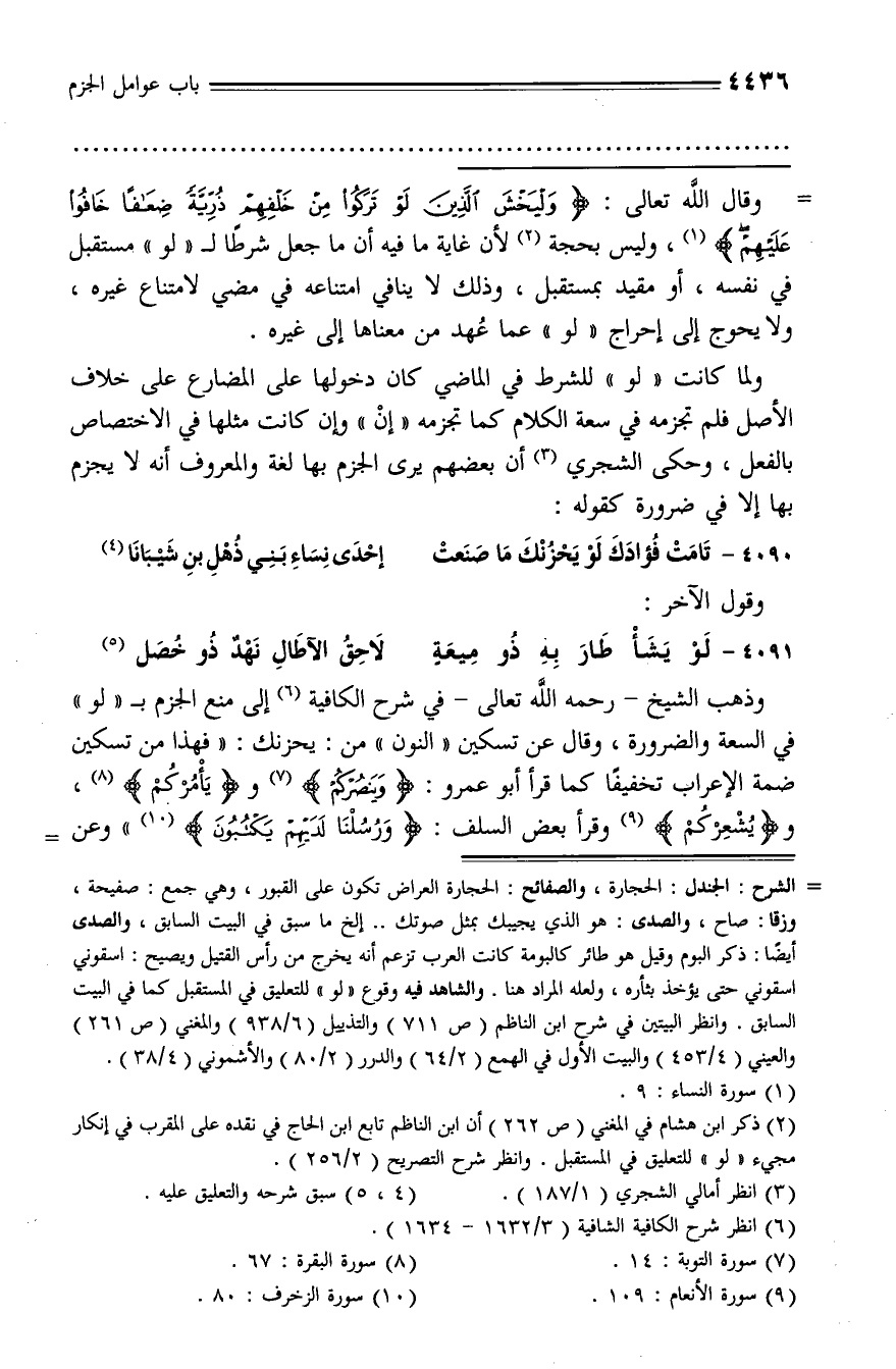 وذهب الشيخ - رحمه الله تعالى - في شرح الكافية (¬6) إلى منع الجزم بـ «لو» في السعة والضرورة، وقال عن تسكين «النون» من: يحزنك: «فهذا من تسكين ضمة الإعراب تخفيفا كما قرأ أبو عمرو: وينصركم (¬7) ويأمركم (¬8)، ويشعركم (¬9) وقرأ بعض السلف: ورسلنا لديهم يكتبون (¬10)» وعن -