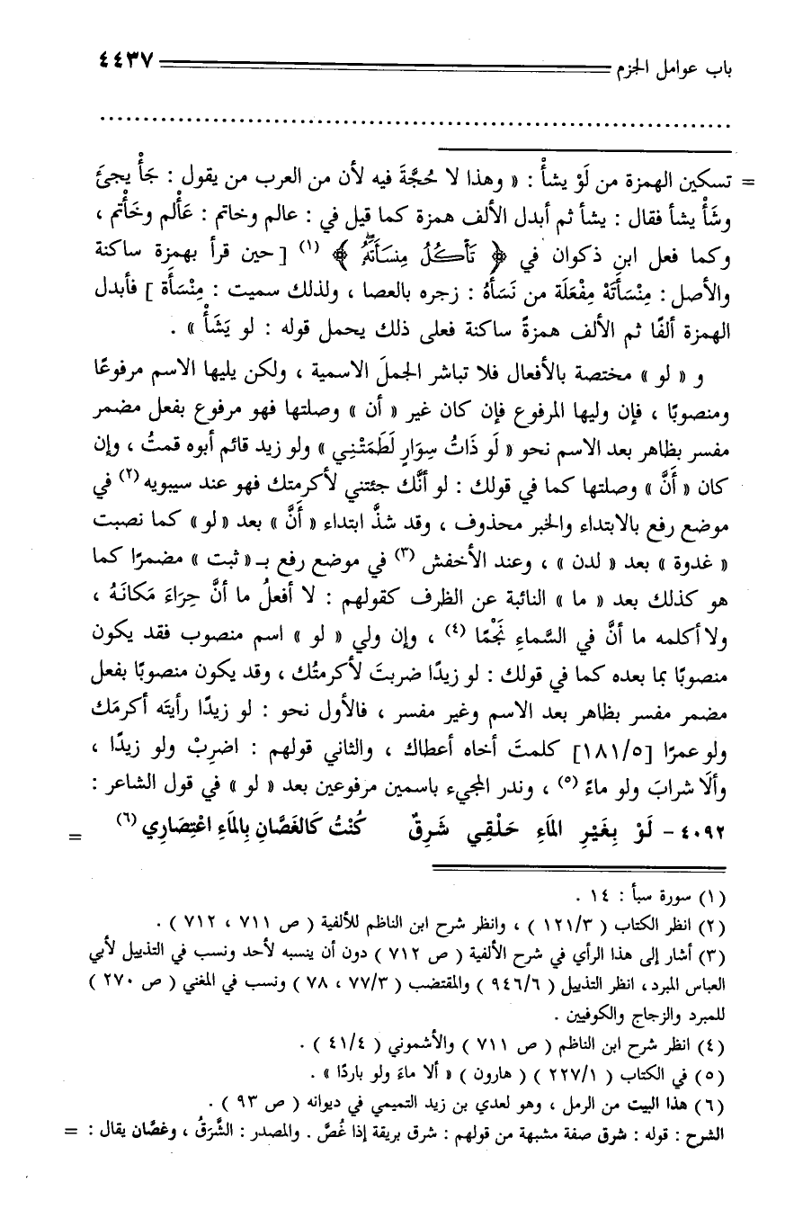 تسكين الهمزة من لو يشأ: «وهذا لا حجّة فيه لأن من العرب من يقول: جأ يجئ وشأ يشأ فقال: يشأ ثم أبدل الألف همزة كما قيل في: عالم وخاتم: عألم وخأتم، وكما فعل ابن ذكوان في تأكل منسأته (¬1) [حين قرأ بهمزة ساكنة والأصل: منسأته مفعلة من نسأه: زجره بالعصا، ولذلك سميت: منسأة] فأبدل الهمزة ألفا ثم الألف همزة ساكنة فعلى ذلك يحمل قوله: لو يشأ».