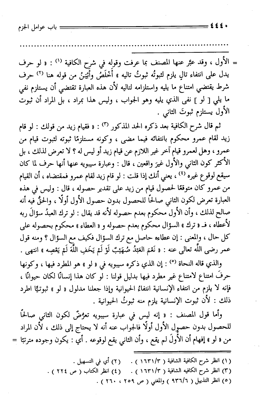 وأما قول المصنف: «إنه ليس في عبارة سيبويه تعرّض لكون الثاني صالحا للحصول بدون حصول الأول أولا فالجواب عنه أنه لا يحتاج إلى ذلك، لأن المراد من «لو» إفهام أن الأول لم يقع، وأن الثاني يقع لوقوعه. أي: يكون وجوده مترتبا -