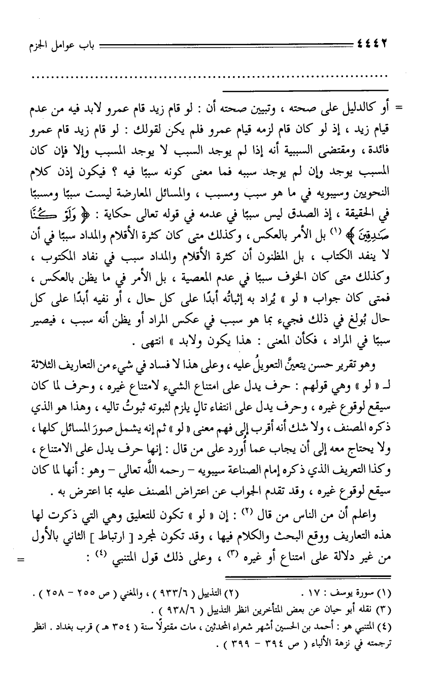 واعلم أن من الناس من قال (¬2): إن «لو» تكون للتعليق وهي التي ذكرت لها هذه التعاريف ووقع البحث والكلام فيها، وقد تكون لمجرد [ارتباط] الثاني بالأول من غير دلالة على امتناع أو غيره (¬3)، وعلى ذلك قول المتنبي (¬4): -