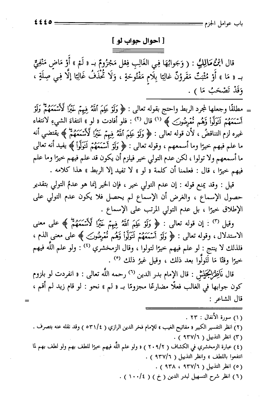 (¬4) عبارة الزمخشري في الكشاف (2/ 209) «ولو علم الله فيهم خيرا للطف بهم ولو لطف بهم لما انتفعوا باللطف» وانظر التذييل (6 /