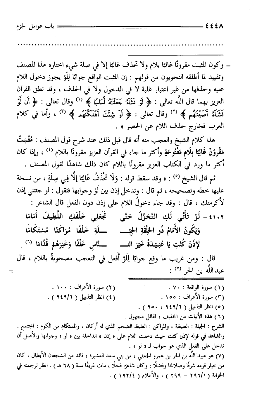 قال: ومن غريب ما وقع جوابا للو أفعل في التعجب مصحوبة باللام، قال عبد الله بن الحر (¬7): -