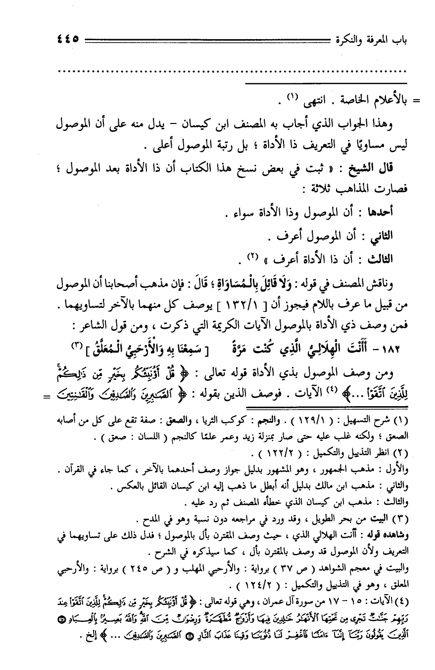 قال الشيخ: «ثبت في بعض نسخ هذا الكتاب أن ذا الأداة بعد الموصول؛ فصارت المذاهب ثلاثة: