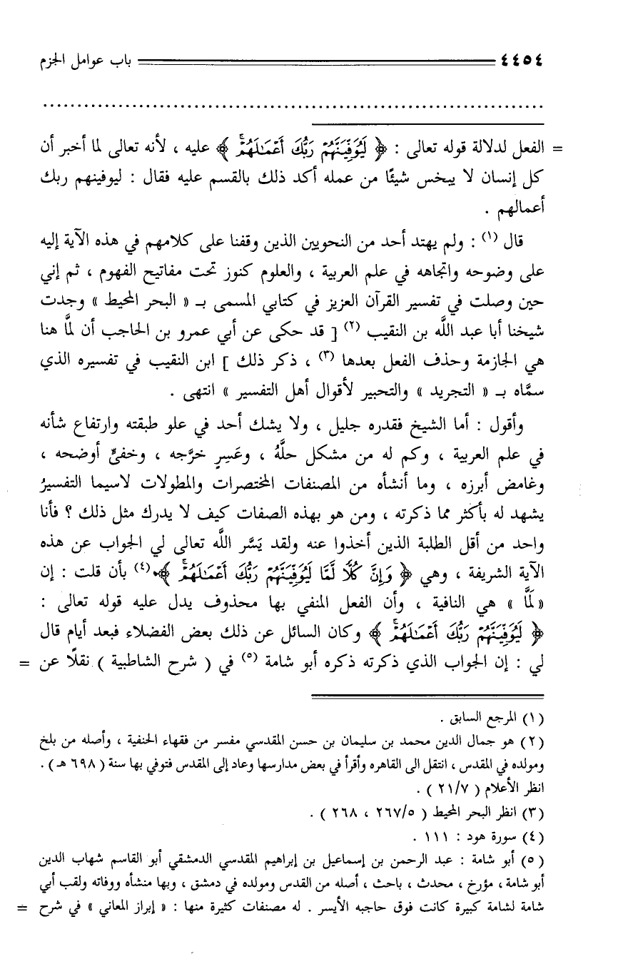 وأقول: أما الشيخ فقدره جليل، ولا يشك أحد في علو طبقته وارتفاع شأنه في علم العربية، وكم له من مشكل حلّه، وعسر خرّجه، وخفىّ أوضحه، وغامض أبرزه، وما أنشأه من المصنفات المختصرات والمطولات لا سيما التفسير يشهد له بأكثر مما ذكرته، ومن هو بهذه الصفات كيف لا يدرك مثل ذلك؟ فأنا واحد من أقل الطلبة الذين أخذوا عنه ولقد يسّر الله تعالى لي الجواب عن هذه الآية الشريفة، وهي وَإِنَّ كُلًّا لَمَّا لَيُوَفِّيَنَّهُمْ رَبُّكَ أَعْمالَهُمْ (¬4) بأن قلت: إن «لمّا» هي النافية، وأن الفعل المنفي بها محذوف يدل عليه قوله تعالى: