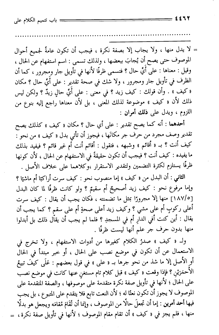 ول «كيف» صدر الكلام كغيرها من أدوات الاستفهام، ولا تخرج في الاستعمال عن أن تكون في موضع نصب على الحال، أو خبر مبتدأ في الحال أو الأصل إلا ما شذ من نحو جرها بـ «على» في قول بعضهم: على كيف تبيع الأحمرين؟ فإذا وقعت «كيف» قبل كلام تام مستغن عنها كانت في موضع نصب على الحال؛ لأنها في تأويل صفة نكرة متقدمة على موصوفها، والصفة المتقدمة على الموصوف لا يجوز أن تكون نعتا له؛ لأن النعت تابع فلا يتقدم على المتبوع، بل يجب فيها أحد أمرين: إما أن تجعل حالا من الموصوف، وإنما أن تقام مقامه ويجعل هو بدلا منها، فلم يجز في «كيف» أن تقام مقام الموصوف؛ لأنها في تأويل صفة نكرة، -