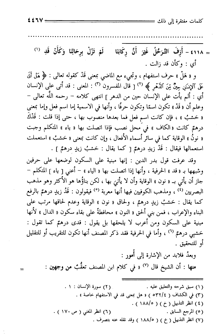 و «هل» حرف استفهام، وتجيء مع الماضي بمعنى قد كقوله تعالى: هَلْ أَتى عَلَى الْإِنْسانِ حِينٌ مِنَ الدَّهْرِ (¬2) [قال المفسرون (¬3): المعنى: قد أتى على الإنسان أي: ألم يأت على الإنسان حين من الدهر] انتهى كلامه - رحمه الله تعالى - وعلم أن «قد» تكون اسما وتكون حرفا، وأنها في الاسمية إما اسم فعل وإما بمعنى «حسب»، فإن كانت اسم فعل فما بعدها منصوب بها، حتى إذا قلت: قدك درهم كانت «الكاف» في محل نصب فإذا اتصلت بها «ياء» المتكلم وجبت «نون» الوقاية كما في سائر أسماء الأفعال، وإن كانت بمعنى «حسب» استعملت استعمالها فيقال: قد زيد درهم [كما يقال: حسب زيد درهم].