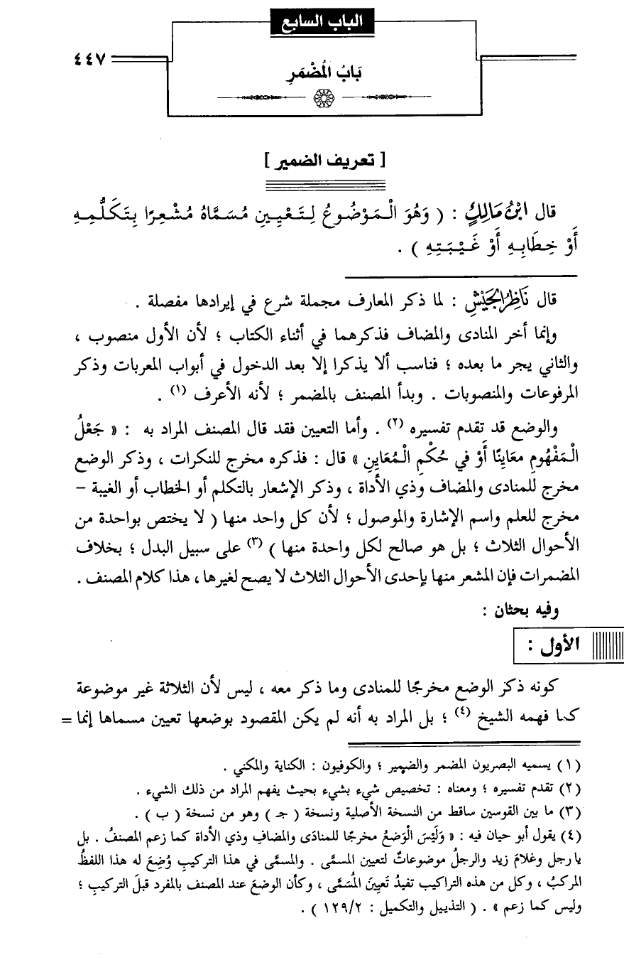 (¬4) يقول أبو حيان فيه: «وليس الوضع مخرجا للمنادى والمضاف وذي الأداة كما زعم المصنف. بل يا رجل وغلام زيد والرجل موضوعات لتعيين المسمّى. والمسمّى في هذا التركيب وضع له هذا اللفظ المركب، وكل من هذه التراكيب تفيد تعيين المسمّى، وكأن الوضع عند المصنف بالمفرد قبل التركيب؛ وليس كما زعم». (التذييل والتكميل: 2/ 129).