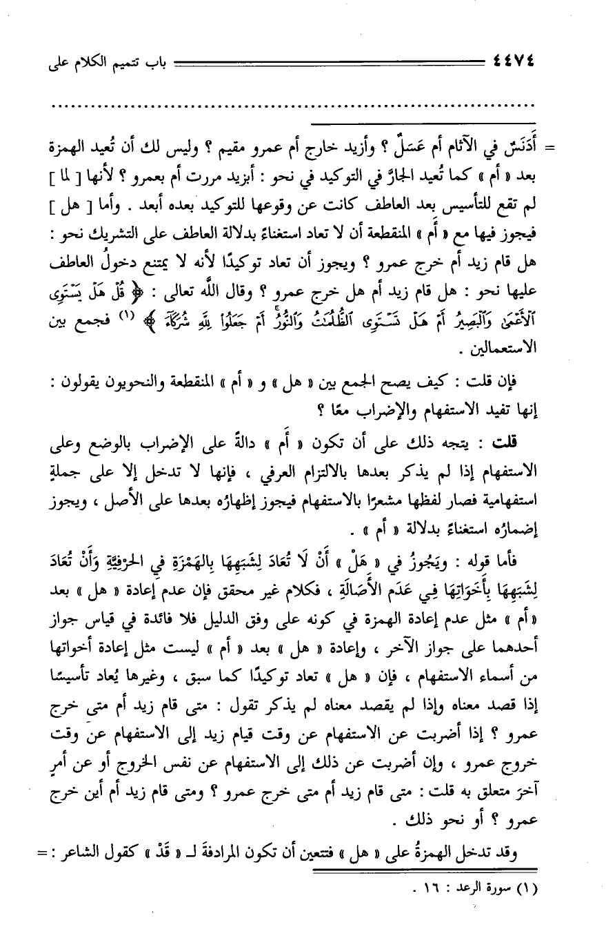 أدنس في الآثام أم عسل؟ وأزيد خارج أم عمرو مقيم؟ وليس لك أن تعيد الهمزة بعد «أم» كما تعيد الجارّ في التوكيد في نحو: أبزيد مررت أم بعمرو؟ لأنها [لما] لم تقع للتأسيس بعد العاطف كانت عن وقوعها للتوكيد بعده أبعد. وأما [هل] فيجوز فيها مع «أم» المنقطعة أن لا تعاد استغناء بدلالة العاطف على التشريك نحو: