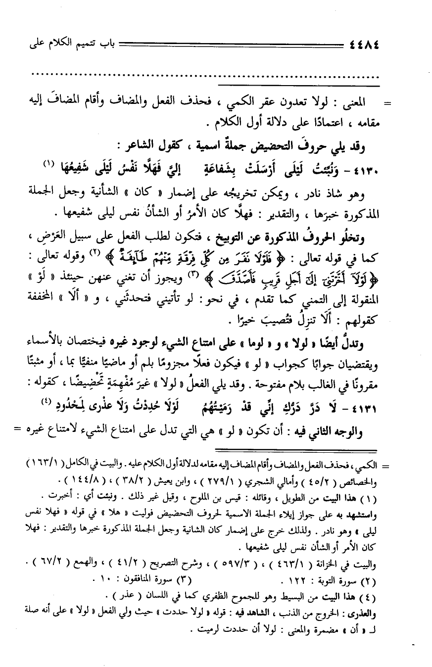 واستشهد به على جواز إيلاء الجملة الاسمية لحروف التحضيض فوليت «هلا» في قوله «فهلا نفس ليلى» وهو نادر. ولذلك خرج على إضمار كان الشانية وجعل الجملة المذكورة خبرها والتقدير: فهلا كان الأمر أو الشأن نفس ليلى شفيعها.