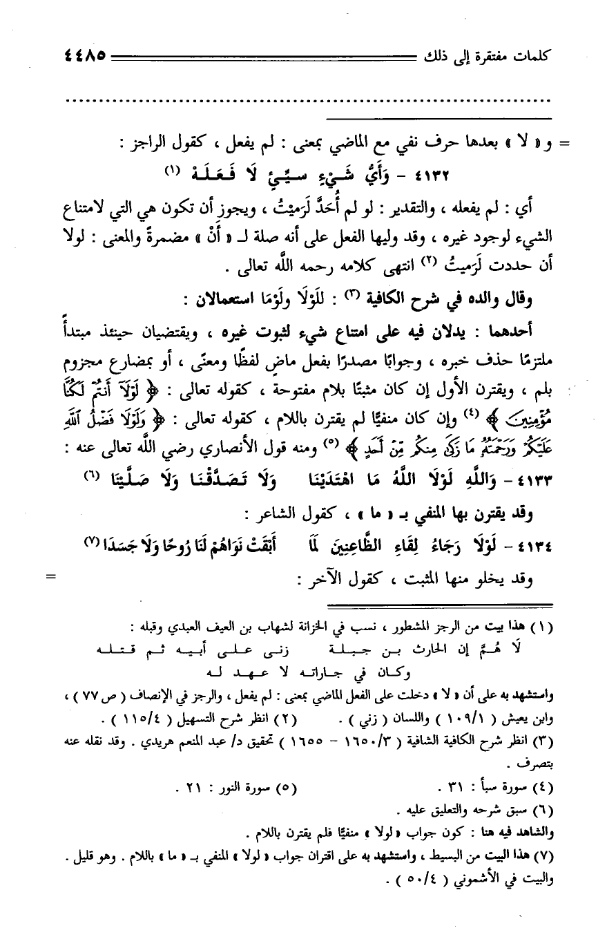 (¬7) هذا البيت من البسيط، واستشهد به على اقتران جواب «لولا» المنفي بـ «ما» باللام. وهو قليل.