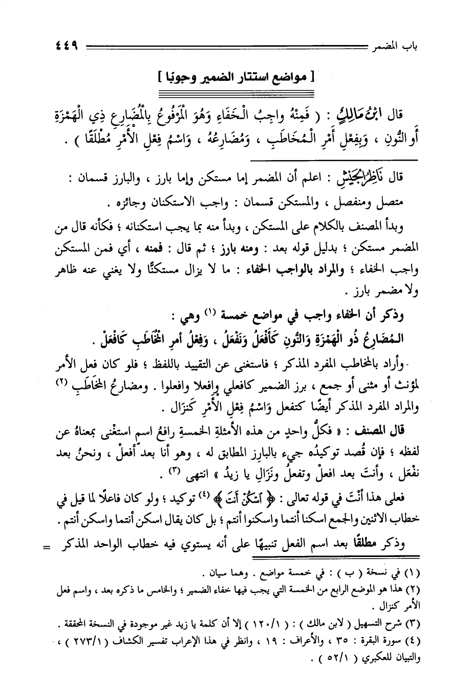 وبدأ المصنف بالكلام على المستكن، وبدأ منه بما يجب استكنانه؛ فكأنه قال من المضمر مستكن؛ بدليل قوله بعد: ومنه بارز؛ ثم قال: فمنه، أي فمن المستكن واجب الخفاء؛ والمراد بالواجب الخفاء: ما لا يزال مستكنّا ولا يغني عنه ظاهر ولا مضمر بارز.