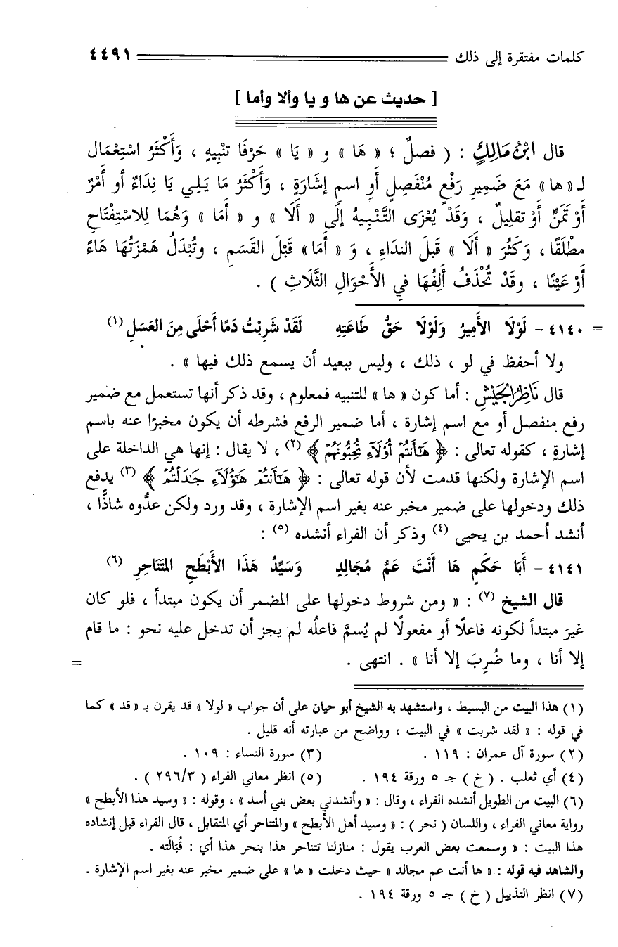 قال ناظر الجيش: أما كون «ها» للتنبيه فمعلوم، وقد ذكر أنها تستعمل مع ضمير رفع منفصل أو مع اسم إشارة، أما ضمير الرفع فشرطه أن يكون مخبرا عنه باسم إشارة، كقوله تعالى: ها أَنْتُمْ أُولاءِ تُحِبُّونَهُمْ (¬2)، لا يقال: إنها هي الداخلة على اسم الإشارة ولكنها قدمت لأن قوله تعالى: ها أَنْتُمْ هؤُلاءِ جادَلْتُمْ (¬3) يدفع ذلك ودخولها على ضمير مخبر عنه بغير اسم الإشارة، وقد ورد ولكن عدّوه شاذّا، أنشد أحمد بن يحيى (¬4) وذكر أن الفراء أنشده (¬5):