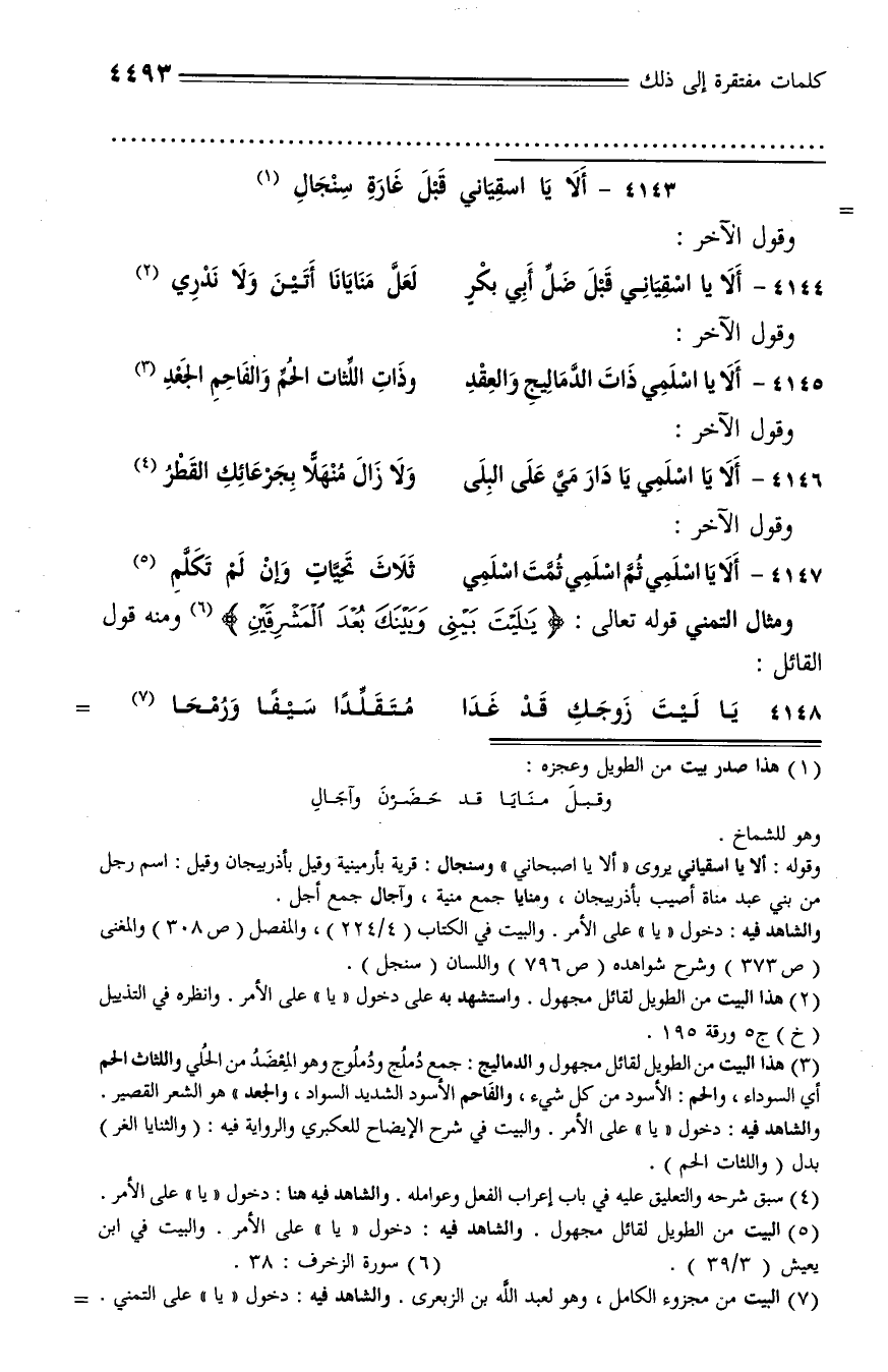 (¬7) البيت من مجزوء الكامل، وهو لعبد الله بن الزبعرى. والشاهد فيه: دخول «يا» على التمني. -