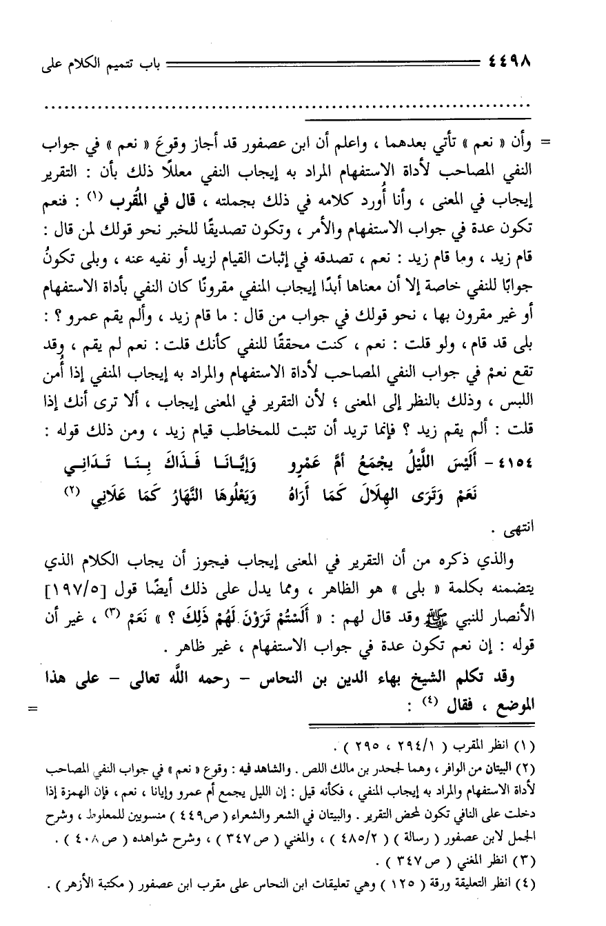 والذي ذكره من أن التقرير في المعنى إيجاب فيجوز أن يجاب الكلام الذي يتضمنه بكلمة «بلى» هو الظاهر، ومما يدل على ذلك أيضا قول [5/ 197] الأنصار للنبي صلّى الله عليه وسلّم وقد قال لهم: «ألستم ترون لهم ذلك؟» نعم (¬3)، غير أن قوله: إن نعم تكون عدة في جواب الاستفهام، غير ظاهر.
