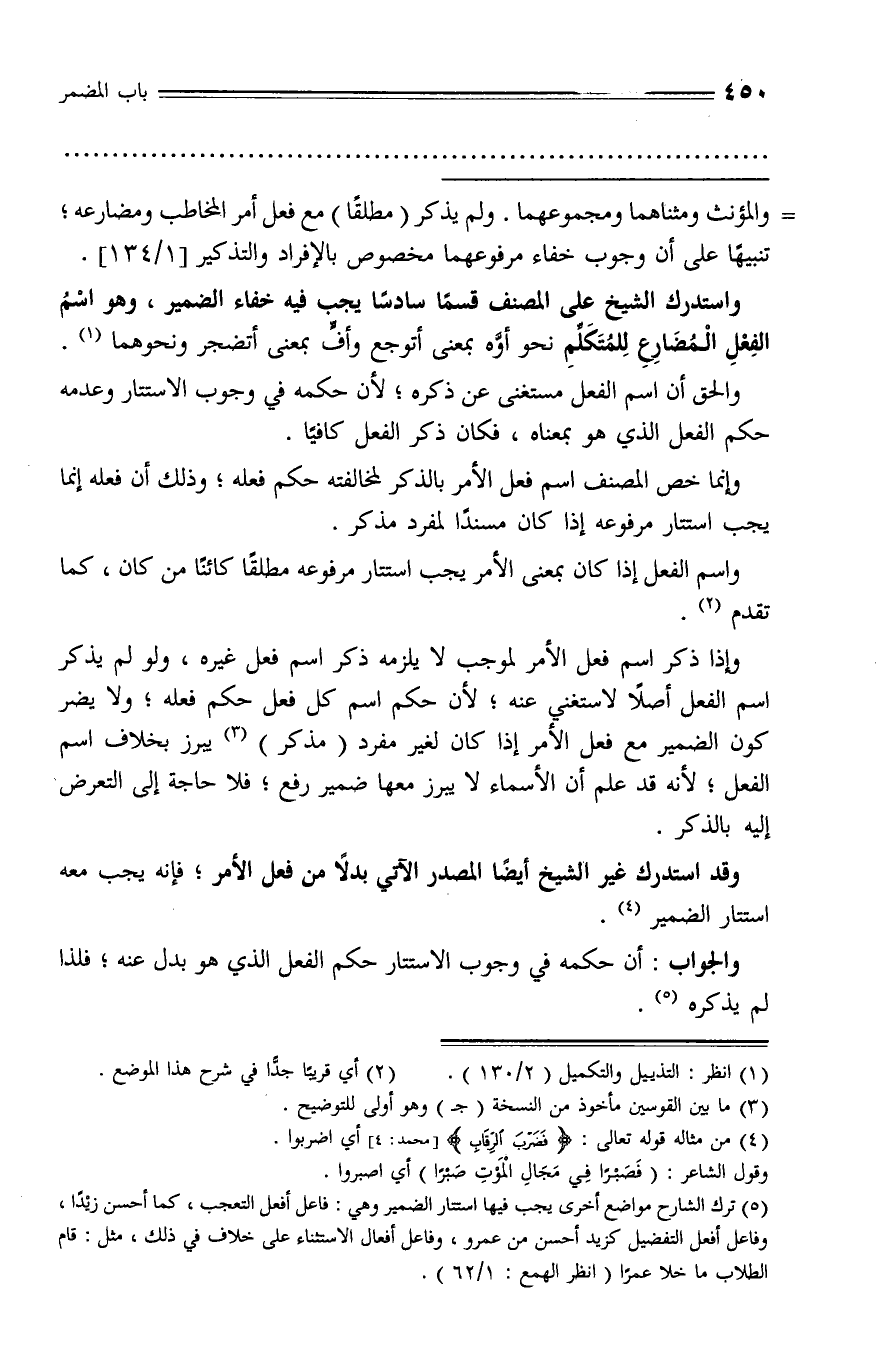 وقد استدرك غير الشيخ أيضا المصدر الآتي بدلا من فعل الأمر؛ فإنه يجب معه استتار الضمير (¬4).