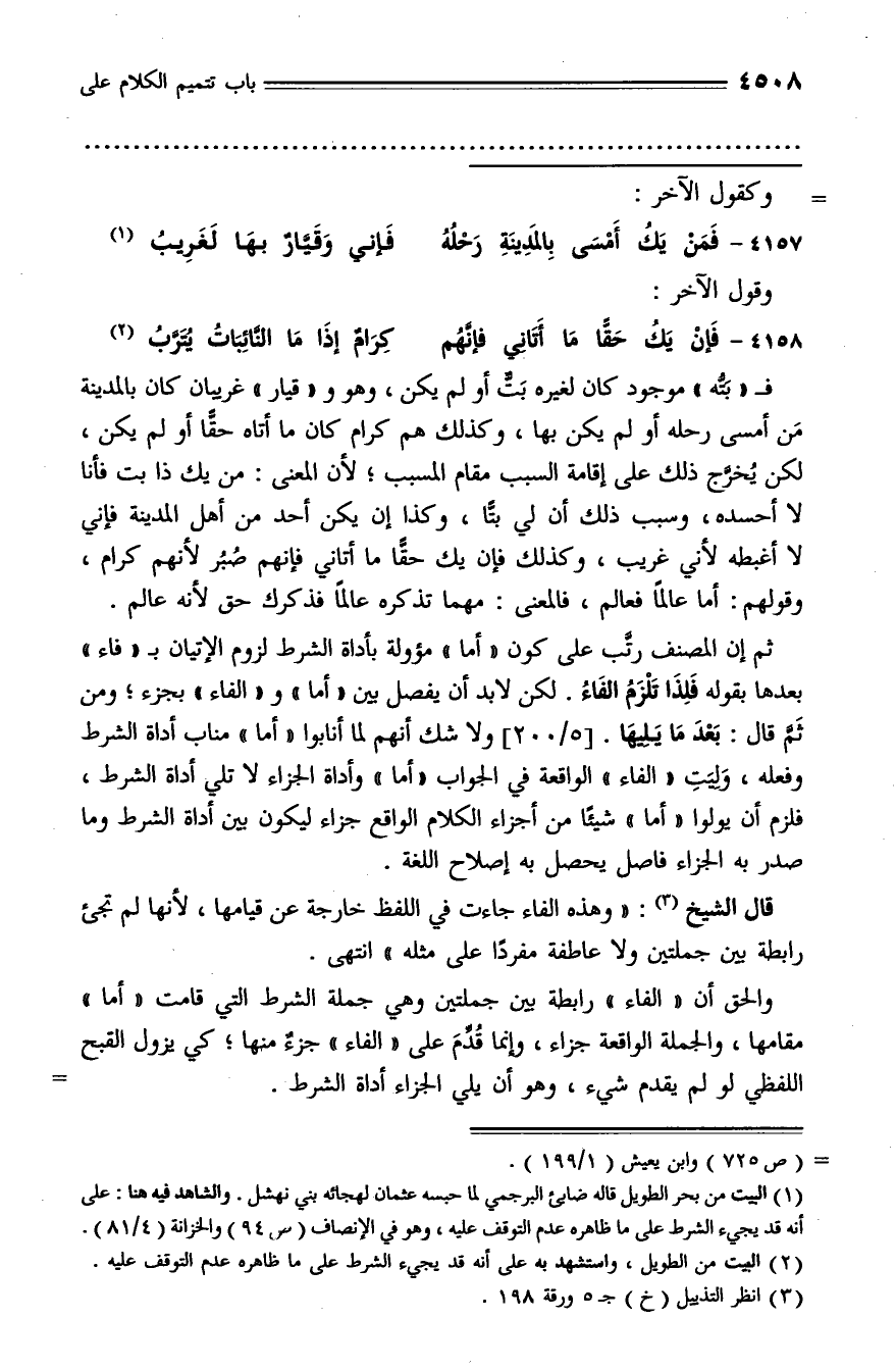 ثم إن المصنف رتّب على كون «أما» مؤولة بأداة الشرط لزوم الإتيان بـ «فاء» بعدها بقوله فلذا تلزم الفاء. لكن لا بد أن يفصل بين «أما» و «الفاء» بجزء؛ ومن ثمّ قال: بعد ما يليها. [5/ 200] ولا شك أنهم لما أنابوا «أما» مناب أداة الشرط، وفعله، وليت «الفاء» الواقعة في الجواب «أما» وأداة الجزاء لا تلي أداة الشرط، فلزم أن يولوا «أما» شيئا من أجزاء الكلام الواقع جزاء ليكون بين أداة الشرط وما صدر به الجزاء فاصل يحصل به إصلاح اللغة.