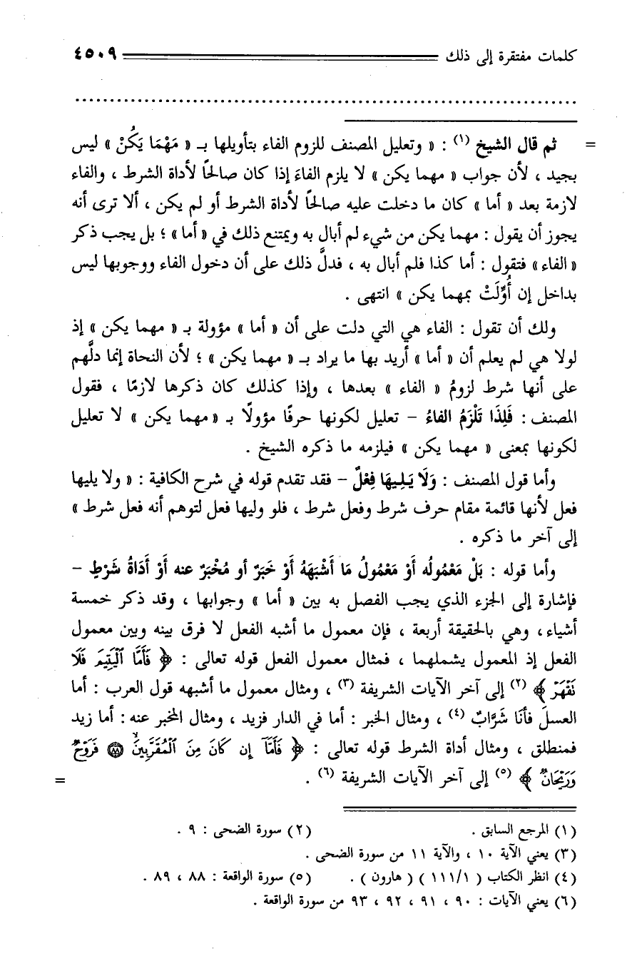 ومثال المخبر عنه: أما زيد فمنطلق، ومثال أداة الشرط قوله تعالى: فَأَمَّا إِنْ كانَ مِنَ الْمُقَرَّبِينَ (88) فَرَوْحٌ وَرَيْحانٌ (¬5) إلى آخر الآيات الشريفة (¬6). -