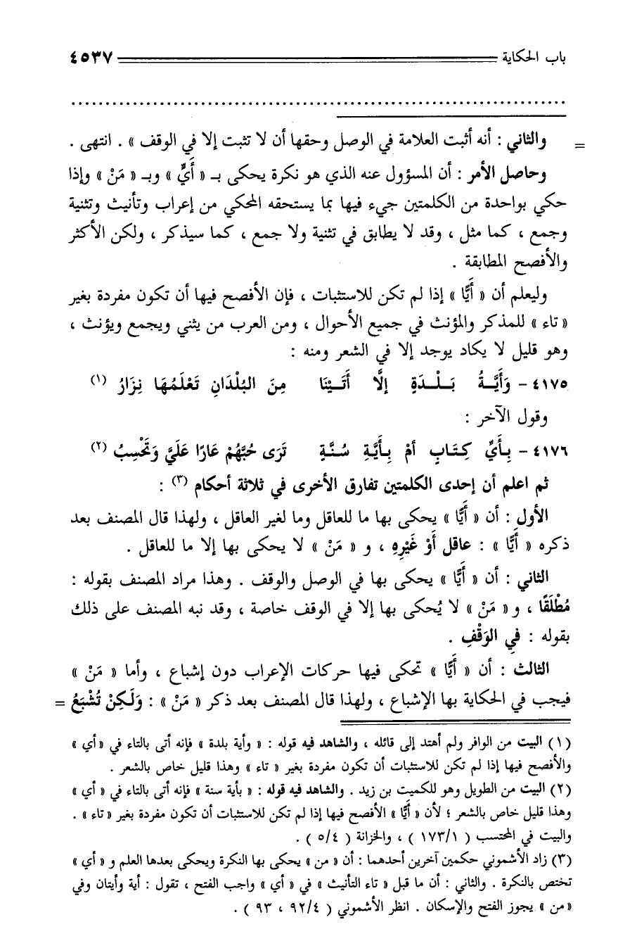 (¬3) زاد الأشموني حكمين آخرين أحدهما: أن «من» يحكى بها النكرة ويحكى بعدها العلم و «أي» تختص بالنكرة. والثاني: أن ما قبل «تاء التأنيث» في «أي» واجب الفتح، تقول: أية وأيتان وفي «من» يجوز الفتح والإسكان. انظر الأشموني (4/ 92، 93).