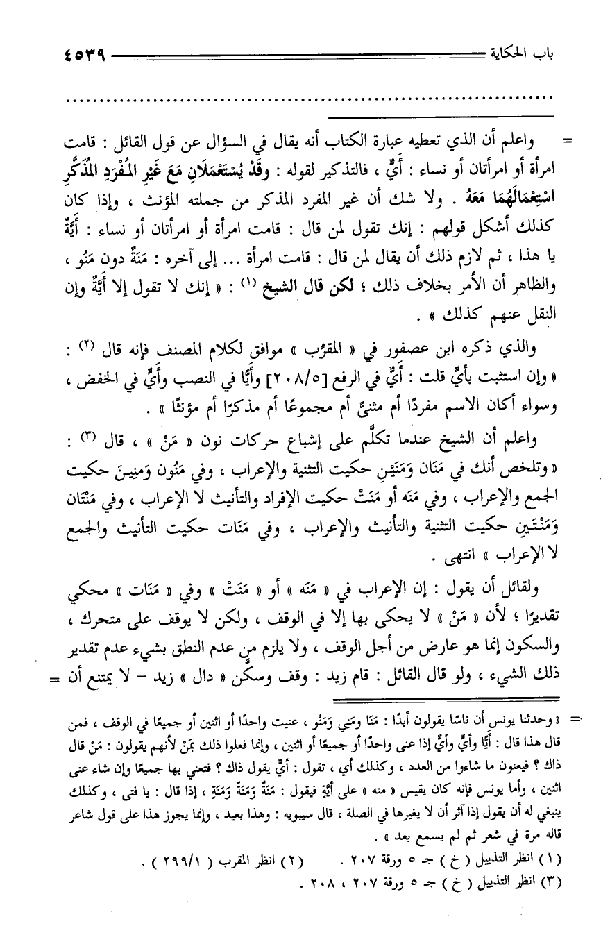 واعلم أن الذي تعطيه عبارة الكتاب أنه يقال في السؤال عن قول القائل: قامت امرأة أو امرأتان أو نساء: أيّ، فالتذكير لقوله: وقد يستعملان مع غير المفرد المذكّر استعمالهما معه. ولا شك أن غير المفرد المذكر من جملته المؤنث، وإذا كان كذلك أشكل قولهم: إنك تقول لمن قال: قامت امرأة أو امرأتان أو نساء: أيّة يا هذا، ثم لازم ذلك أن يقال لمن قال: قامت امرأة ... إلى آخره: منة دون منو، والظاهر أن الأمر بخلاف ذلك؛ لكن قال الشيخ (¬1): «إنك لا تقول إلا أيّة وإن النقل عنهم كذلك».