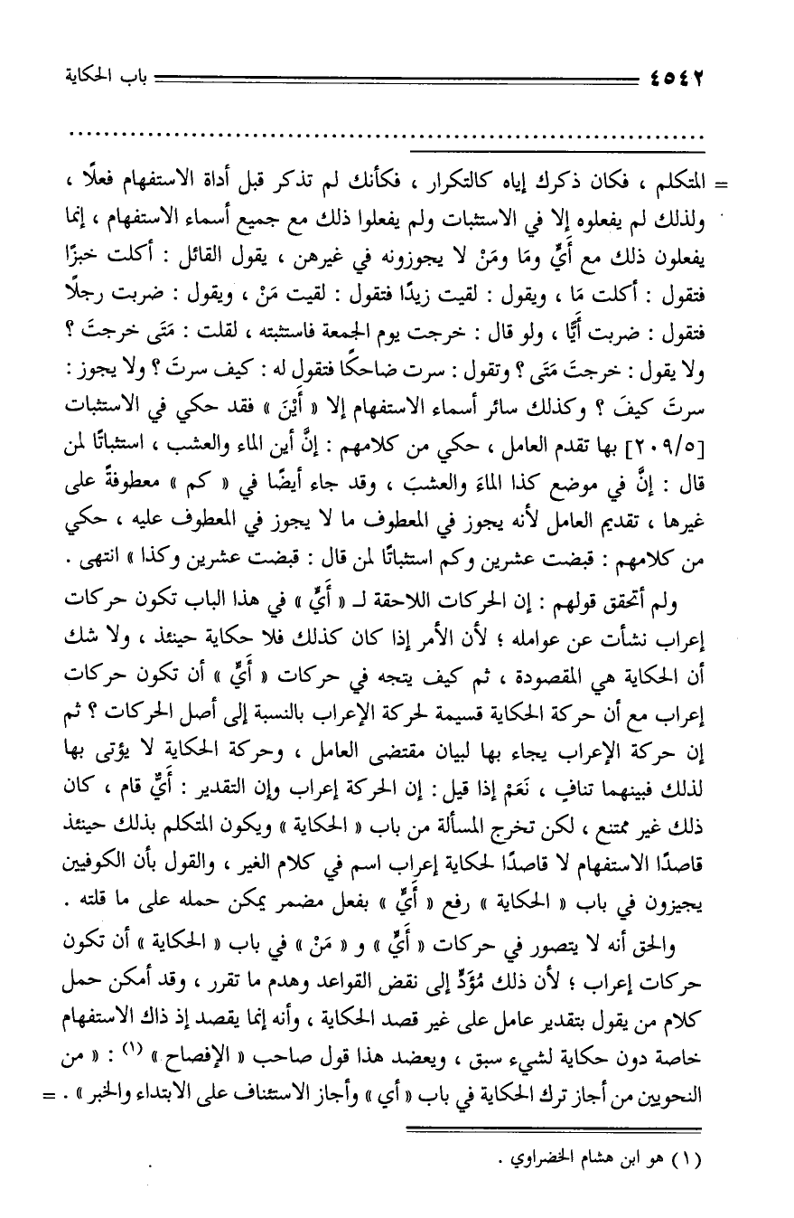 ولم أتحقق قولهم: إن الحركات اللاحقة لـ «أيّ» في هذا الباب تكون حركات إعراب نشأت عن عوامله؛ لأن الأمر إذا كان كذلك فلا حكاية حينئذ، ولا شك أن الحكاية هي المقصودة، ثم كيف يتجه في حركات «أيّ» أن تكون حركات إعراب مع أن حركة الحكاية قسيمة لحركة الإعراب بالنسبة إلى أصل الحركات؟ ثم إن حركة الإعراب يجاء بها لبيان مقتضى العامل، وحركة الحكاية لا يؤتى بها لذلك فبينهما تناف، نعم إذا قيل: إن الحركة إعراب وإن التقدير: أيّ قام، كان ذلك غير ممتنع، لكن تخرج المسألة من باب «الحكاية» ويكون المتكلم بذلك حينئذ قاصدا الاستفهام لا قاصدا لحكاية إعراب اسم في كلام الغير، والقول بأن الكوفيين يجيزون في باب «الحكاية» رفع «أيّ» بفعل مضمر يمكن حمله على ما قلته.