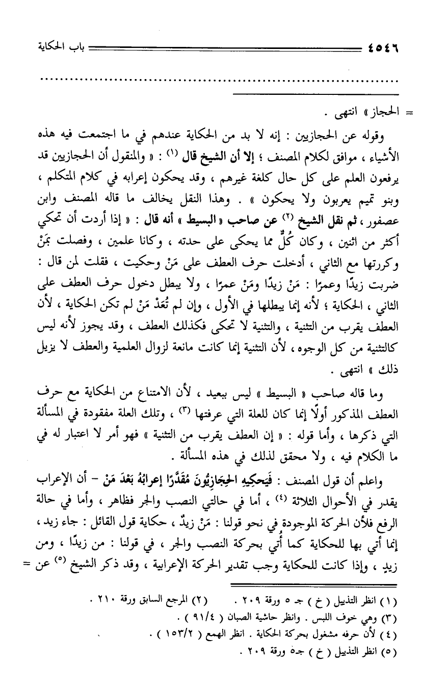 وما قاله صاحب «البسيط» ليس ببعيد، لأن الامتناع من الحكاية مع حرف العطف المذكور أولا إنما كان للعلة التي عرفتها (¬3)، وتلك العلة مفقودة في المسألة التي ذكرها، وأما قوله: «إن العطف يقرب من التثنية» فهو أمر لا اعتبار له في ما الكلام فيه، ولا محقق لذلك في هذه المسألة.