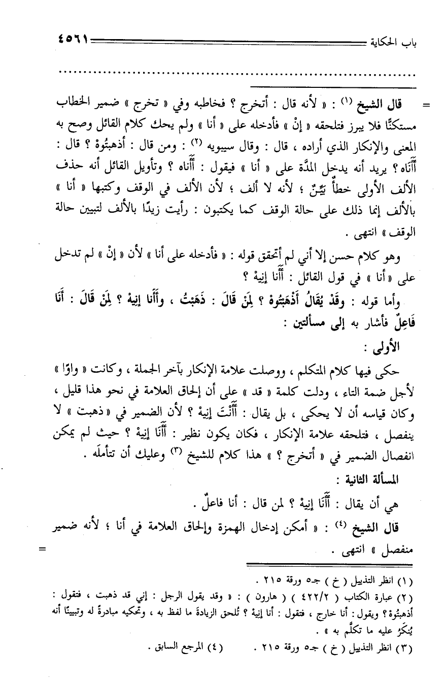 حكى فيها كلام المتكلم، ووصلت علامة الإنكار بآخر الجملة، وكانت «واوا» لأجل ضمة التاء، ودلت كلمة «قد» على أن إلحاق العلامة في نحو هذا قليل، وكان قياسه أن لا يحكى، بل يقال: أأنت إنيه؟ لأن الضمير في «ذهبت» لا ينفصل، فتلحقه علامة الإنكار، فكان يكون نظير: أأنا إنيه؟ حيث لم يمكن انفصال الضمير في «أتخرج؟» هذا كلام للشيخ (¬3) وعليك أن تتأمله.
