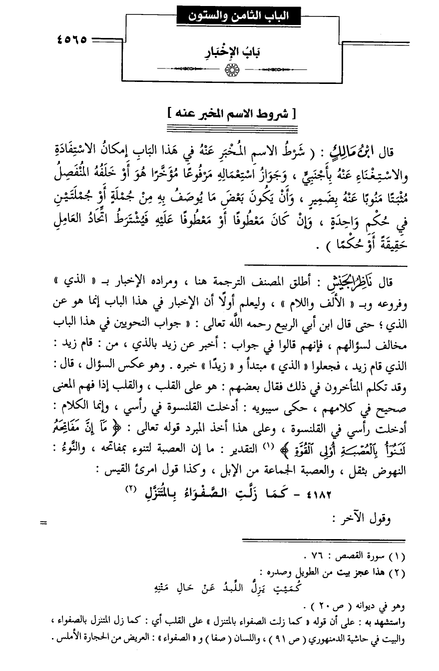 قال ناظر الجيش: أطلق المصنف الترجمة هنا، ومراده الإخبار بـ «الذي» وفروعه وب «الألف واللام»، وليعلم أولا أن الإخبار في هذا الباب إنما هو عن الذي؛ حتى قال ابن أبي الربيع رحمه الله تعالى: «جواب النحويين في هذا الباب مخالف لسؤالهم، فإنهم قالوا في جواب: أخبر عن زيد بالذي، من: قام زيد: