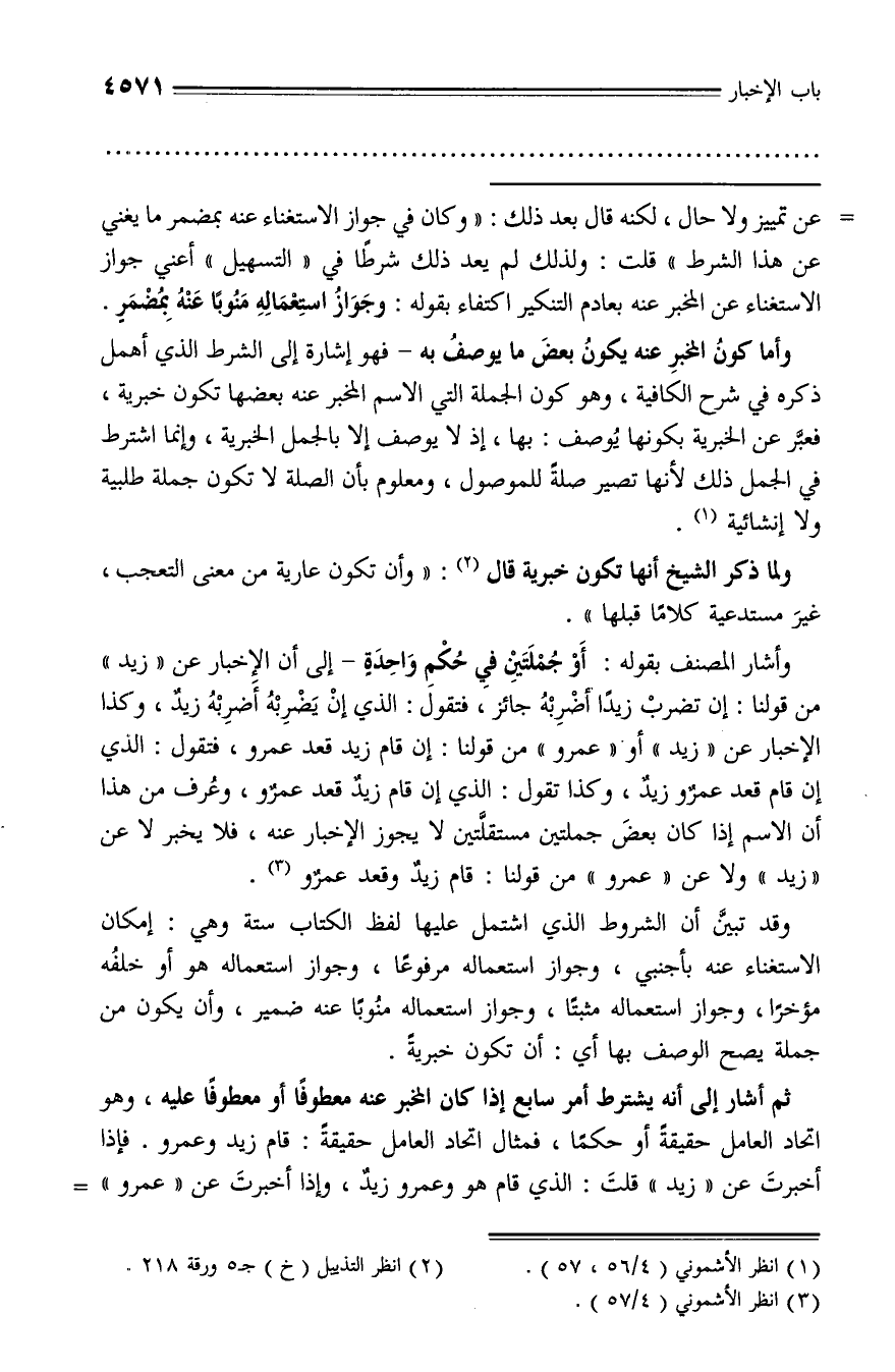 وأما كون المخبر عنه يكون بعض ما يوصف به - فهو إشارة إلى الشرط الذي أهمل ذكره في شرح الكافية، وهو كون الجملة التي الاسم المخبر عنه بعضها تكون خبرية، فعبّر عن الخبرية بكونها يوصف: بها، إذ لا يوصف إلا بالجمل الخبرية، وإنما اشترط في الجمل ذلك لأنها تصير صلة للموصول، ومعلوم بأن الصلة لا تكون جملة طلبية ولا إنشائية (¬1).