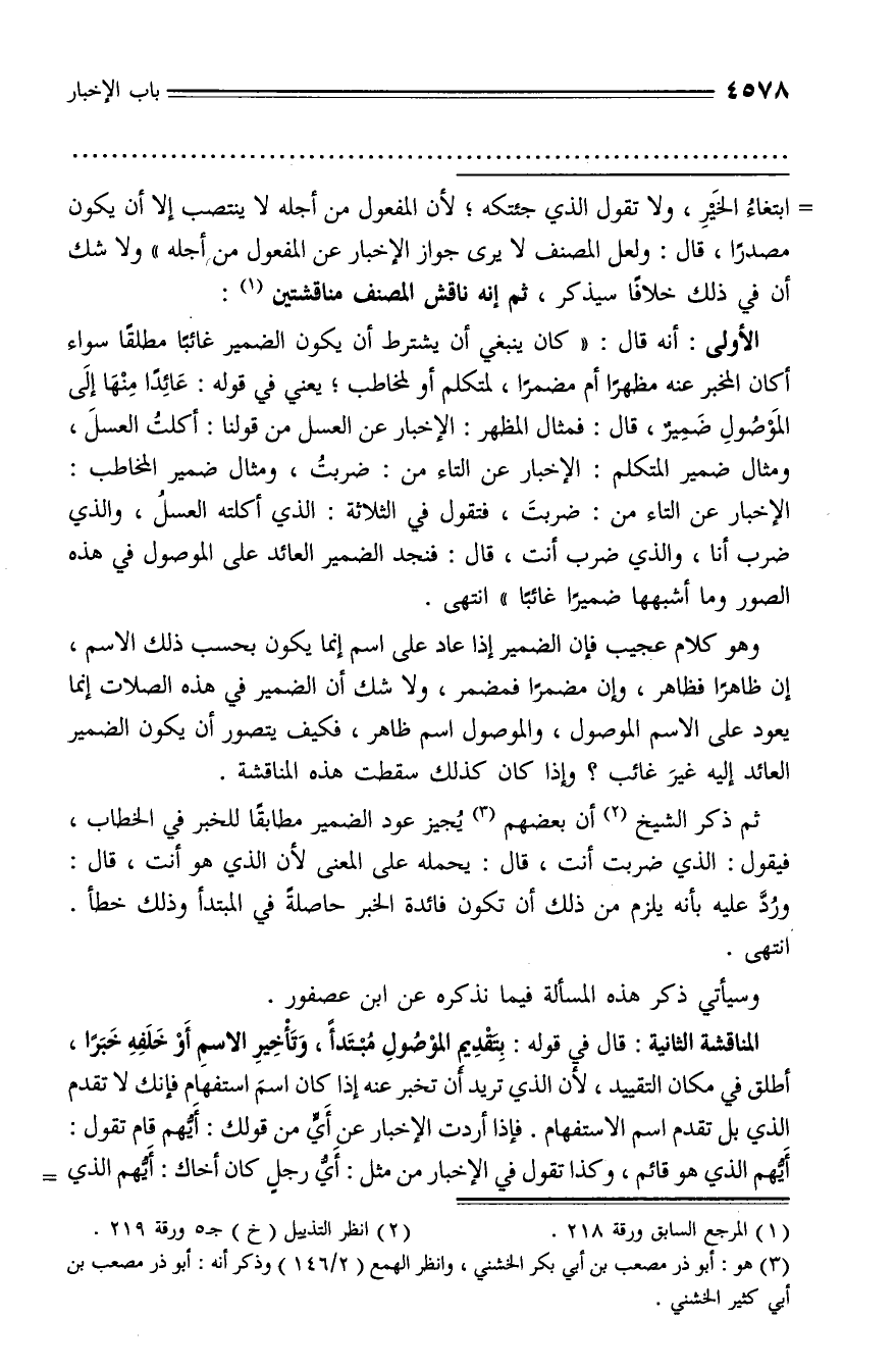 المناقشة الثانية: قال في قوله: بتقديم الموصول مبتدأ، وتأخير الاسم أو خلفه خبرا، أطلق في مكان التقييد، لأن الذي تريد أن تخبر عنه إذا كان اسم استفهام فإنك لا تقدم الذي بل تقدم اسم الاستفهام. فإذا أردت الإخبار عن أيّ من قولك: أيّهم قام تقول: