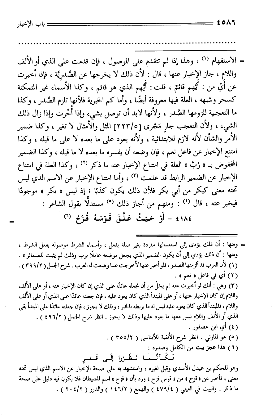 الاستفهام (¬1)، وهذا إذا لم تتقدم على الموصول، فإن قدمت على الذي أو الألف واللام، جاز الإخبار عنها، قال: لأن ذلك لا يخرجها عن الصّدريّة، فإذا أخبرت عن أيّ من: أيّهم قائم، قلت: أيّهم الذي هو قائم، وكذا الأسماء غير المتمكنة كسحر وشبهه، العلة فيها معروفة أيضا، وأما كم الخبرية فلأنها تلزم الصّدر، وكذا ما التعجبية للزومها الصّدر، ولأنها لا بد أن توصل بشيء وإذا أخّرت وإذا زال ذلك الشيء، ولأن التعجب جار مجرى [5/ 223] المثل والأمثال لا تغير، وكذا ضمير الأمر والشأن لأنه لازم للابتدائية، ولأنه يعود على ما بعده لا على ما قبله، وكذا امتنع الإخبار عن فاعل نعم، فإن وضعه أن يفسره ما بعده لا ما قبله، وكذا الضمير المخفوض بـ «ربّ» العلة في امتناع الإخبار عنه ما ذكر (¬2)، وكذا العلة في امتناع الإخبار عن الضمير الرابط قد علمت (¬3)، وأما امتناع الإخبار عن الاسم الذي ليس تحته معنى كبكر من أبي بكر فلأن ذلك يكون كذبا؛ إذ ليس «بكر» موجودا فيخبر عنه، قال (¬4): ومنهم من أجاز ذلك (¬5) مستدلّا بقول الشاعر: