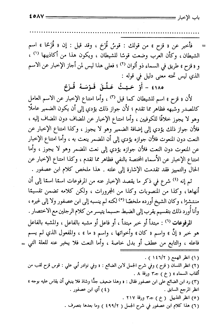 لأن «قزح» اسم للشيطان كما قيل (¬3)، وأما امتناع الإخبار عن الاسم العامل كالمصدر وشبهه فظاهر مما تقدم؛ لأن جواز ذلك يؤدي إلى أن يكون الضمير عاملا وهو لا يجوز خلافا للكوفيين، وأما امتناع الإخبار عن المضاف دون المضاف إليه، فلأن جواز ذلك يؤدي إلى إضافة الضمير وهو لا يجوز، وكذا امتناع الإخبار عن النعت دون المنعوت فلأن جوازه يؤدي إلى أن المضمر ينعت به، وأما امتناع الإخبار عن المنعوت دون النعت فلأن جوازه يؤدي إلى نعت المضمر وهو لا يجوز، وأما امتناع الإخبار عن الأسماء المختصة بالنفي فظاهر مما تقدم، وكذا امتناع الإخبار عن الحال والتمييز فقد تقدمت الإشارة إلى علته. هذا ملخص كلام ابن عصفور.