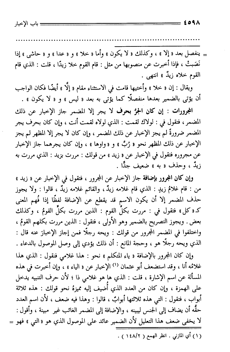 المجرورات: إن كان الجرّ بحرف لا يجر إلا المضمر جاز الإخبار عن ذلك المضمر، فتقول في: لولاك لقمت: الذي لولاه لقمت أنت، وإن كان بحرف يجر المضمر ضرورة لم يجز الإخبار عن ذلك المضمر، وإن كان لا يجر إلا المظهر لم يجز الإخبار عن ذلك المظهر نحو «ربّ» و «واوها»، وإن كان يجرهما جاز الإخبار عن مجروره فتقول في الإخبار عن «زيد» من قولك: مررت بزيد: الذي مررت به زيد، وحذف «به» ضعيف جدّا.