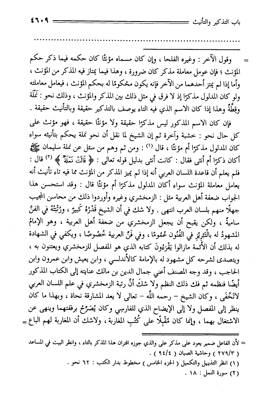 فلم يعلم أن قاعدة اللسان العربي أنه إذا لم يميز المذكر من المؤنث مما فيه تاء تأنيث أنه يعامل معاملة المؤنث سواء أكان المدلول مذكرا أم مؤنثا قال: وقد استحسن هذا الجواب ضعفة أهل العربية مثل: الزمخشري وغيره وأوردوا ذلك من محاسن المجيب جهلا منهم بلسان العرب انتهى. ولا شك في أن الشيخ قدره كبير، ورتبته في الفنّ سامية، ولكن يقبح أن يجعل الزمخشري من ضعفة أهل العربية، وهو الإمام المشهود له بالتبريز في الفنون عموما، وفي فنّ العربية خصوصا، ويكفي في الشهادة له بذلك أن الأئمة ما زالوا يقرءون كتابه الذي هو المفصل للزمخشري ويعتنون به، ويتصدى لشرحه كل مشهود له بالإمامة كالأندلسي، وابن يعيش وابن عمرون وابن الحاجب، وقد وجه المصنف أعني جمال الدين بن مالك عنايته إلى الكتاب المذكور أيضا فنظمه ثم فك ذلك النظم ولا شك أنّ رتبة الزمخشري في علم اللسان العربي لا تخفى، وكان الشيخ - رحمه الله - تعالى لا يعد المشارقة نحاة، وبهذا ما كان ينظر إلى المفصل ولا إلى الإيضاح الذي للفارسي وكان يصرّح برفقتهما وينهى عن الاشتغال بهما، وإنما كان مقبلا على كتب المغاربة، ولا شك أن المغاربة لهم الباع -